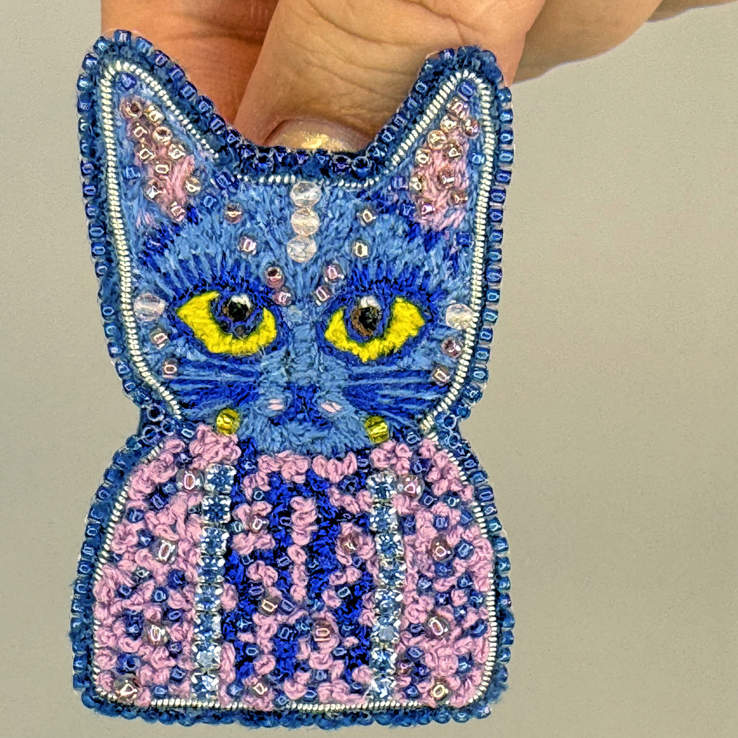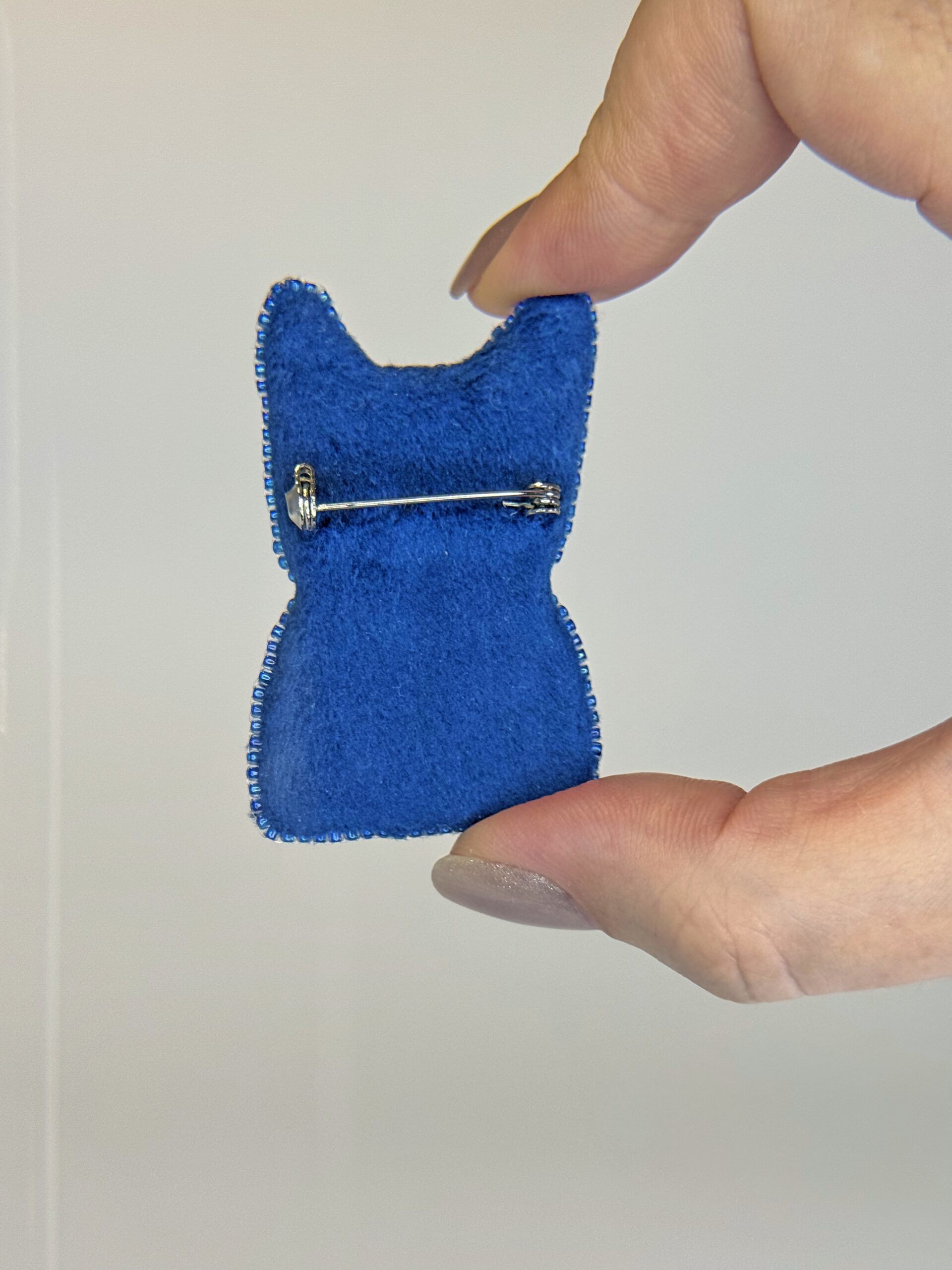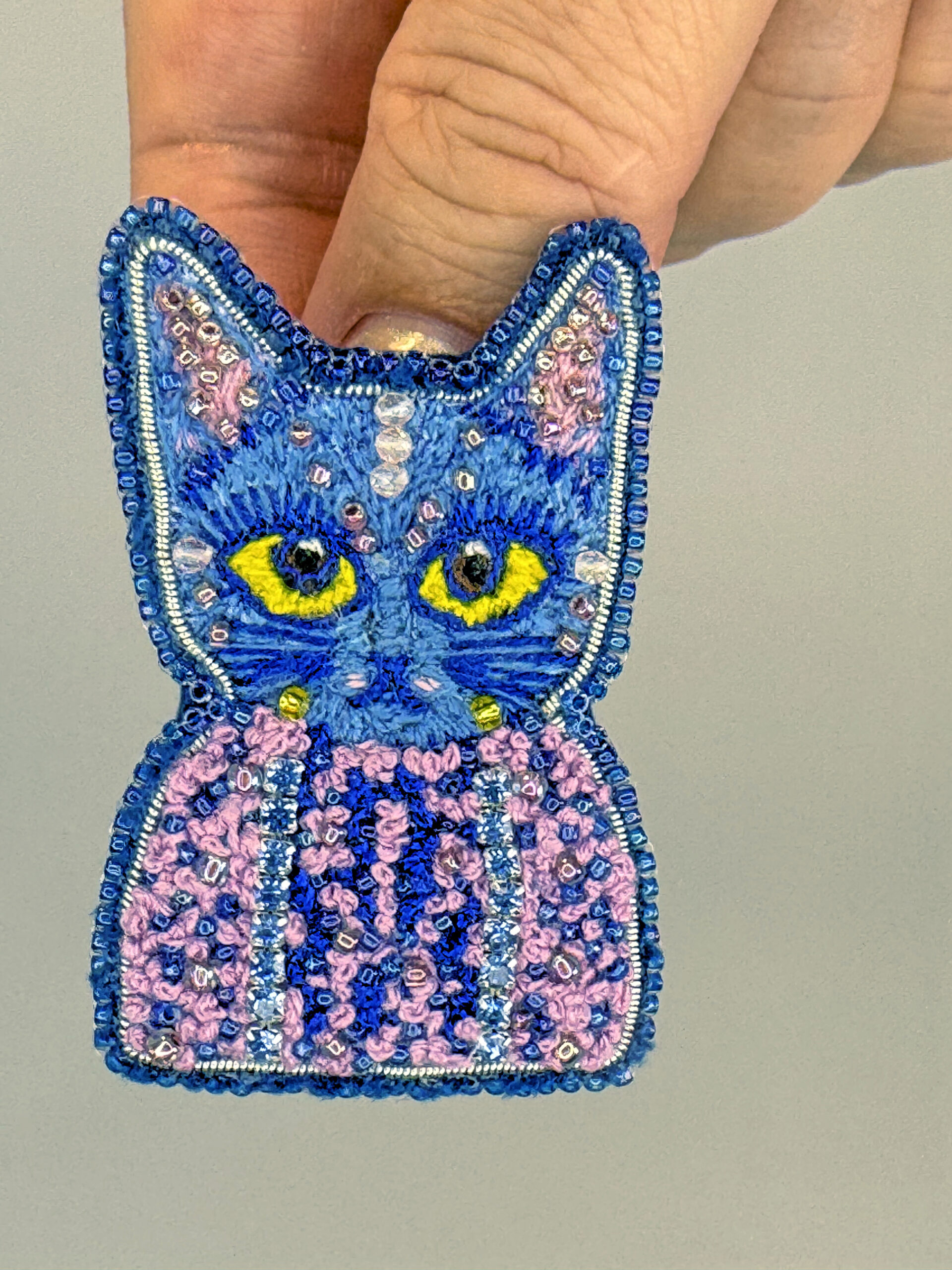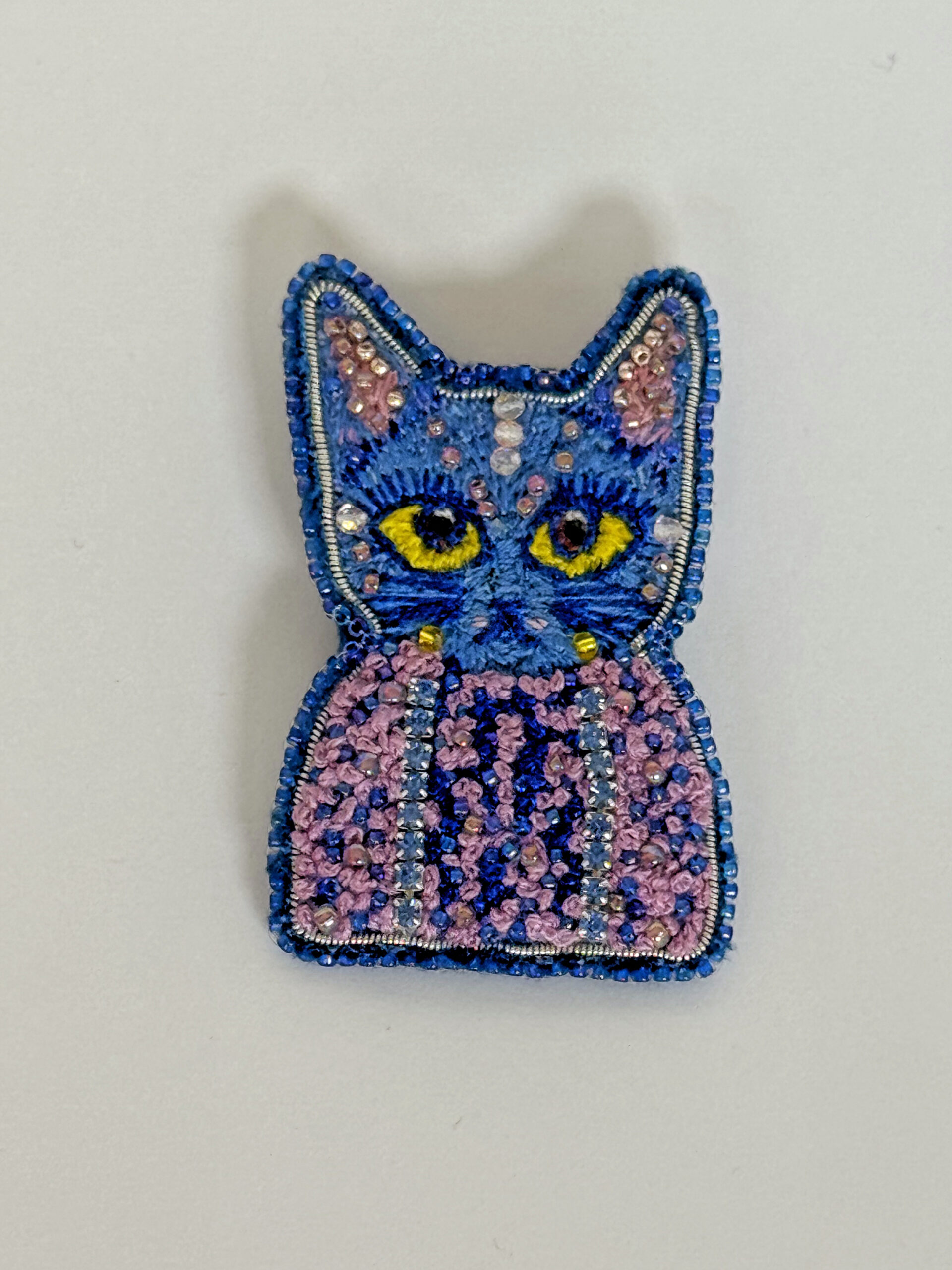 A cat-shaped brooch decorated with intricate embroidery and beads. Meticulously hand-embroidered, it features a beautiful color combination and a unique design. Whether you’re a cat lover or simply a fan of unique accessories, this brooch is sure to turn heads.