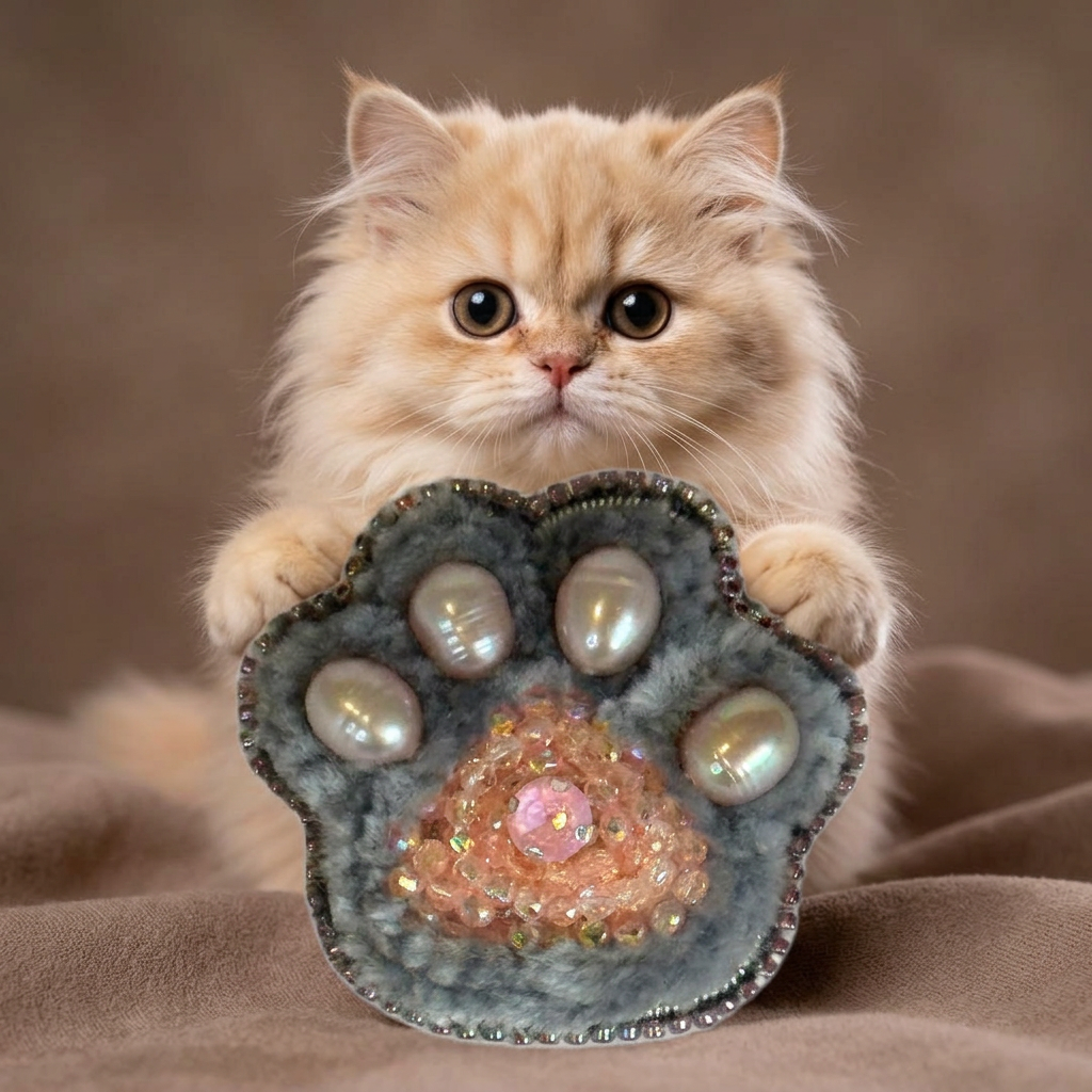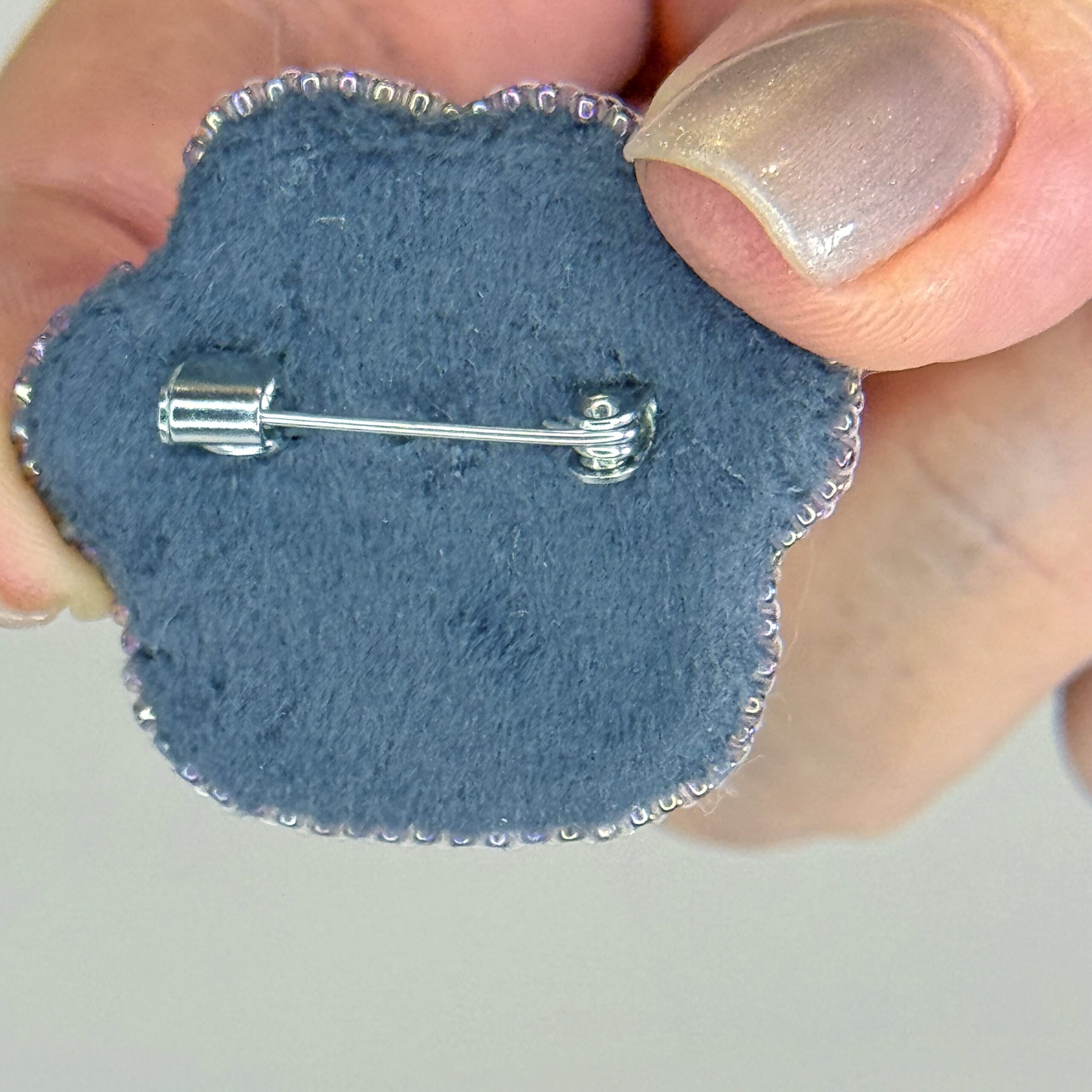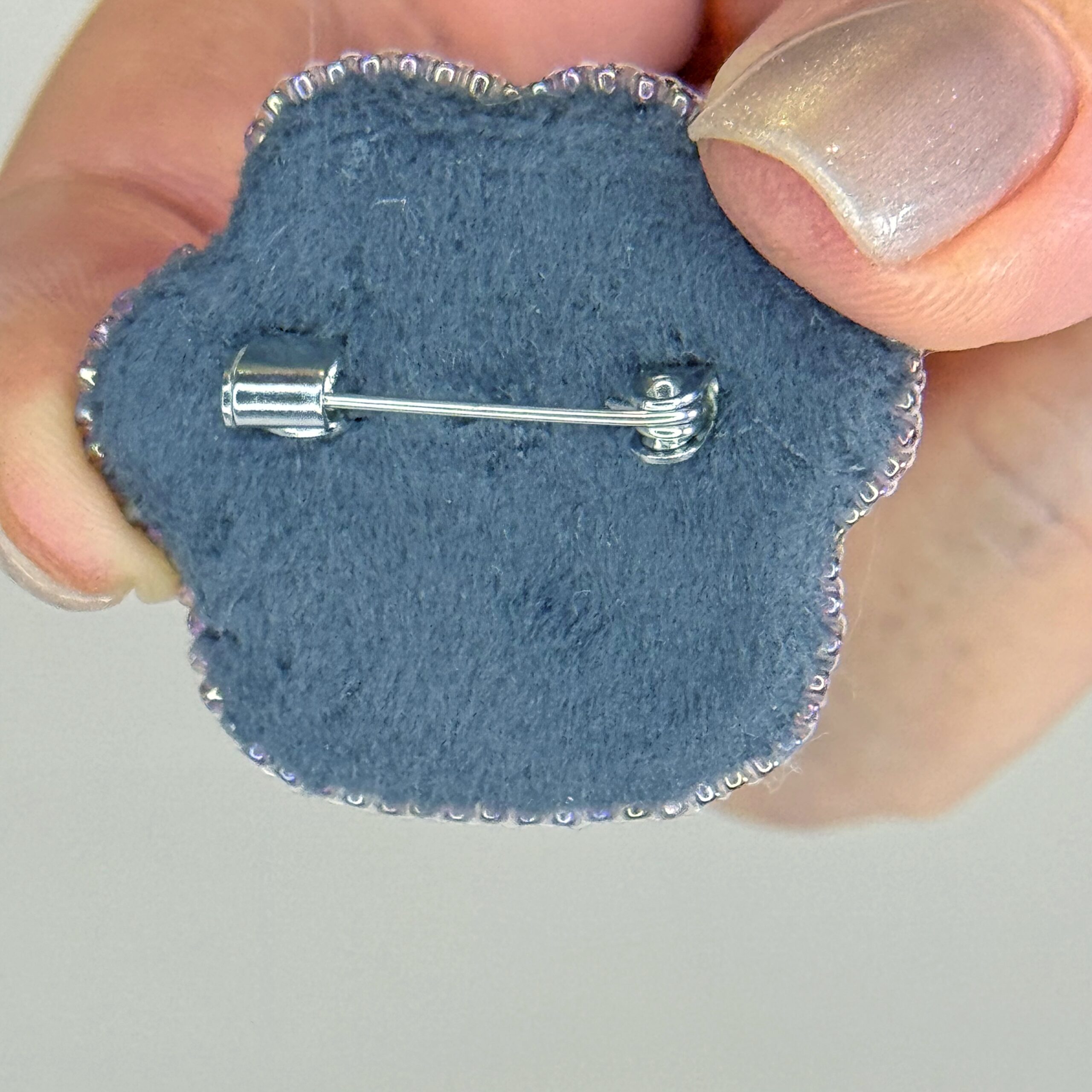 A sweet, tactile tribute to our beloved animal companions — this handcrafted paw print brooch is worked in a sophisticated grey and blush pink palette. The four toe pads are formed from lustrous grey pearl beads that have a beautiful, organic sheen. The central paw pad features a charming cluster of rose and blush pink crystal beads in a soft, rosy arrangement. A border of silver seed beads frames the entire paw with a clean, polished edge.