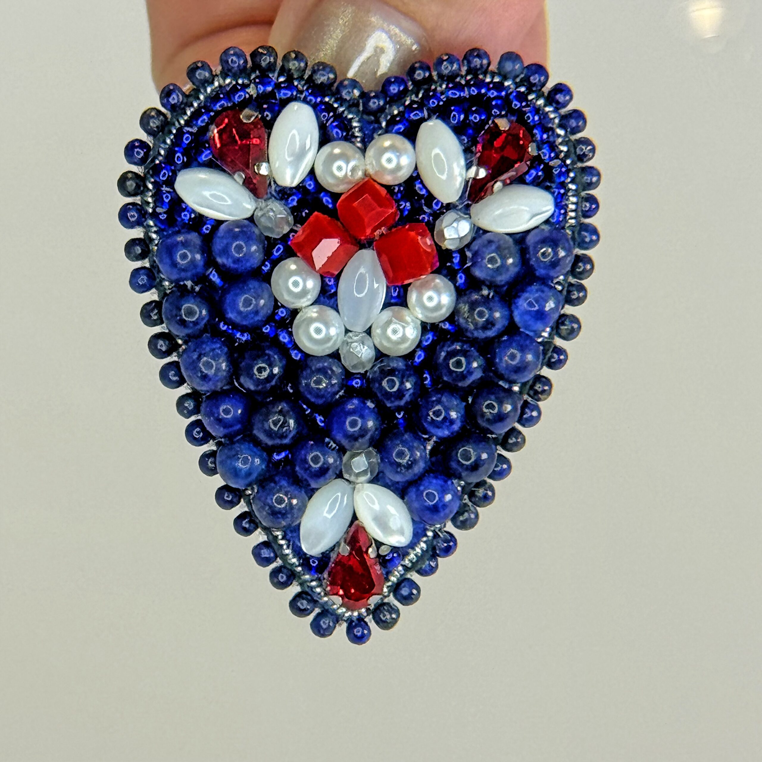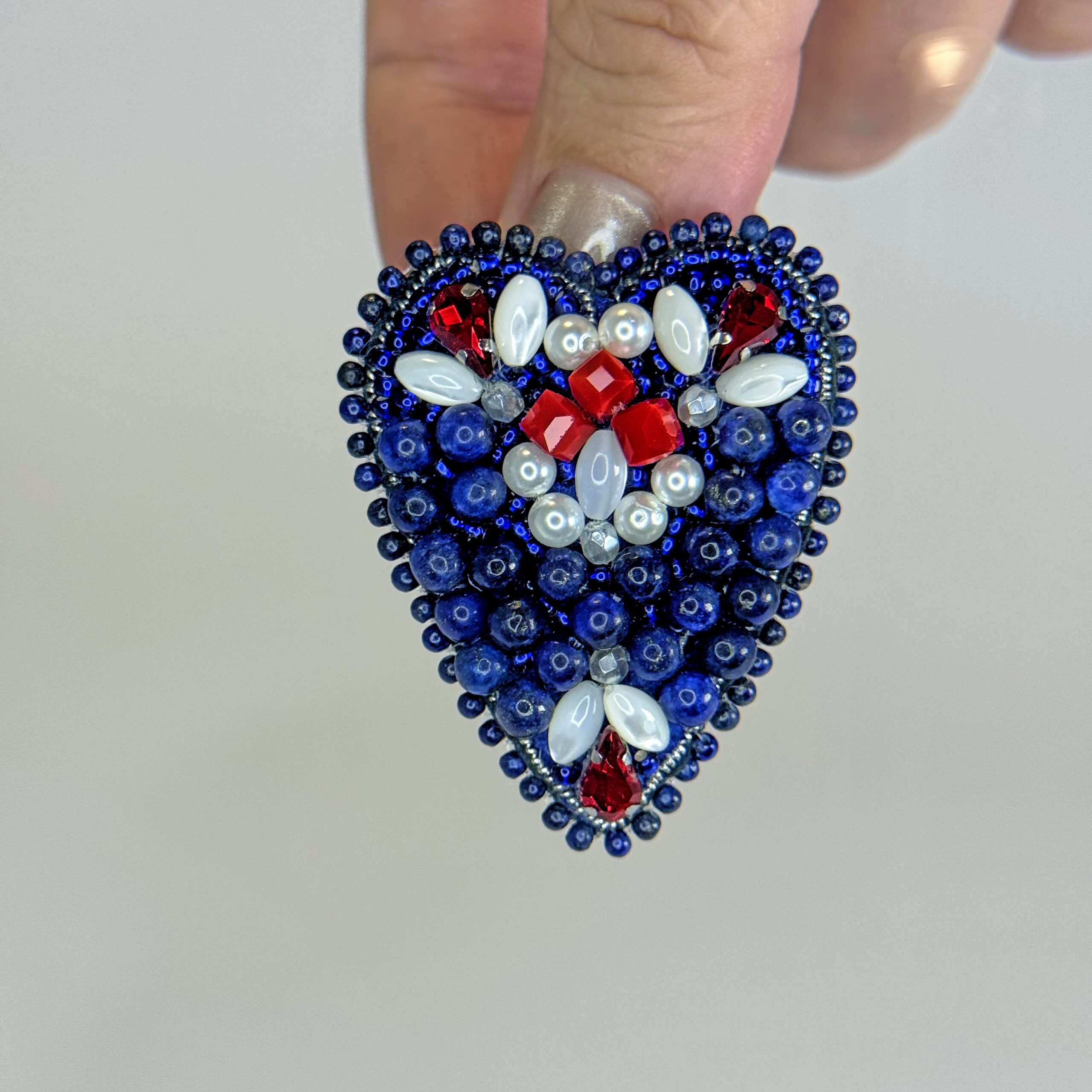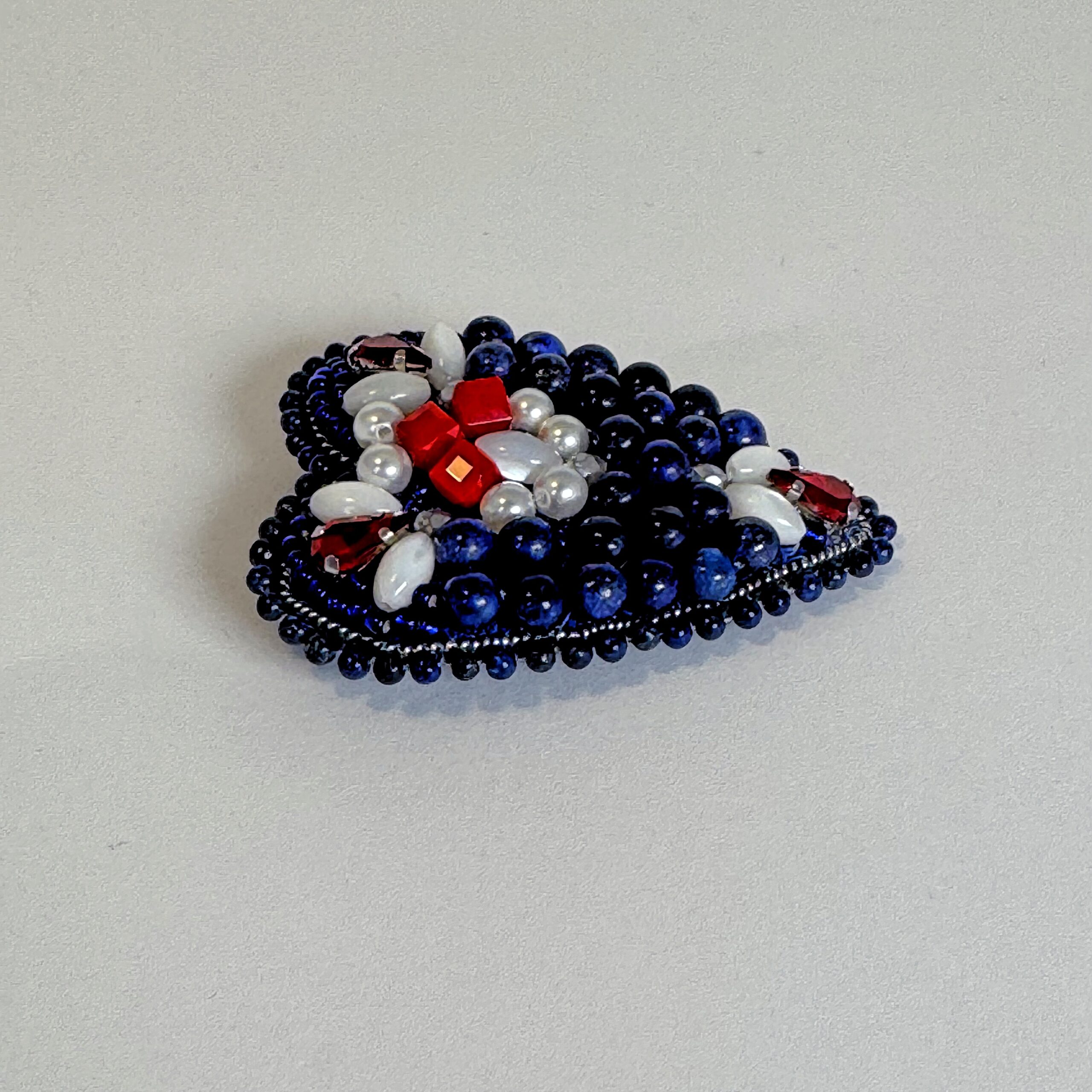 This handcrafted heart brooch features a rich Lapis Lazuli center, framed by the iridescent glow of natural Mother of Pearl. Accented with vibrant red crystals, this piece is designed for those who love jewelry with meaning and contrast. Whether it’s a gift for a loved one or a treat for yourself, this heart adds touch to any outfit.