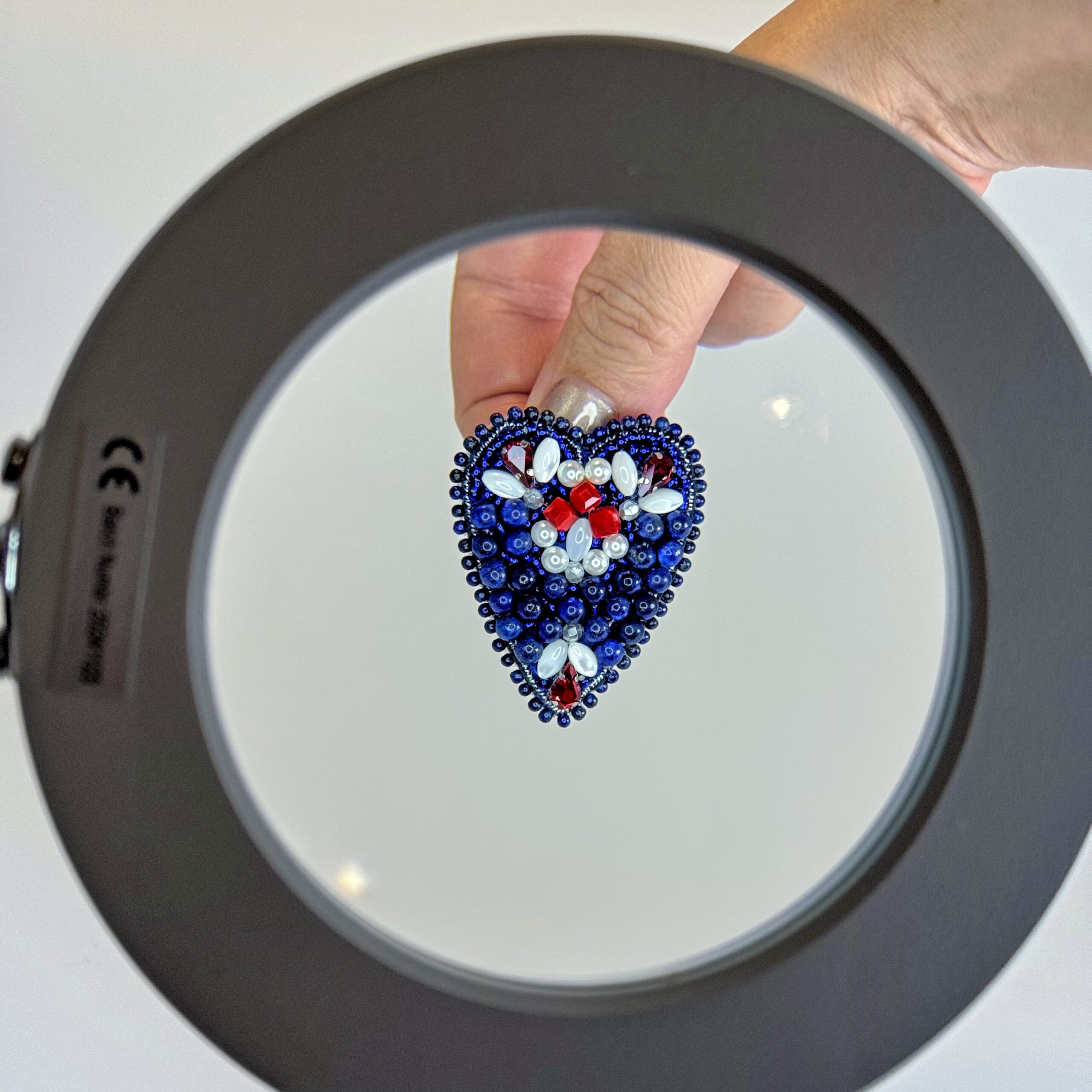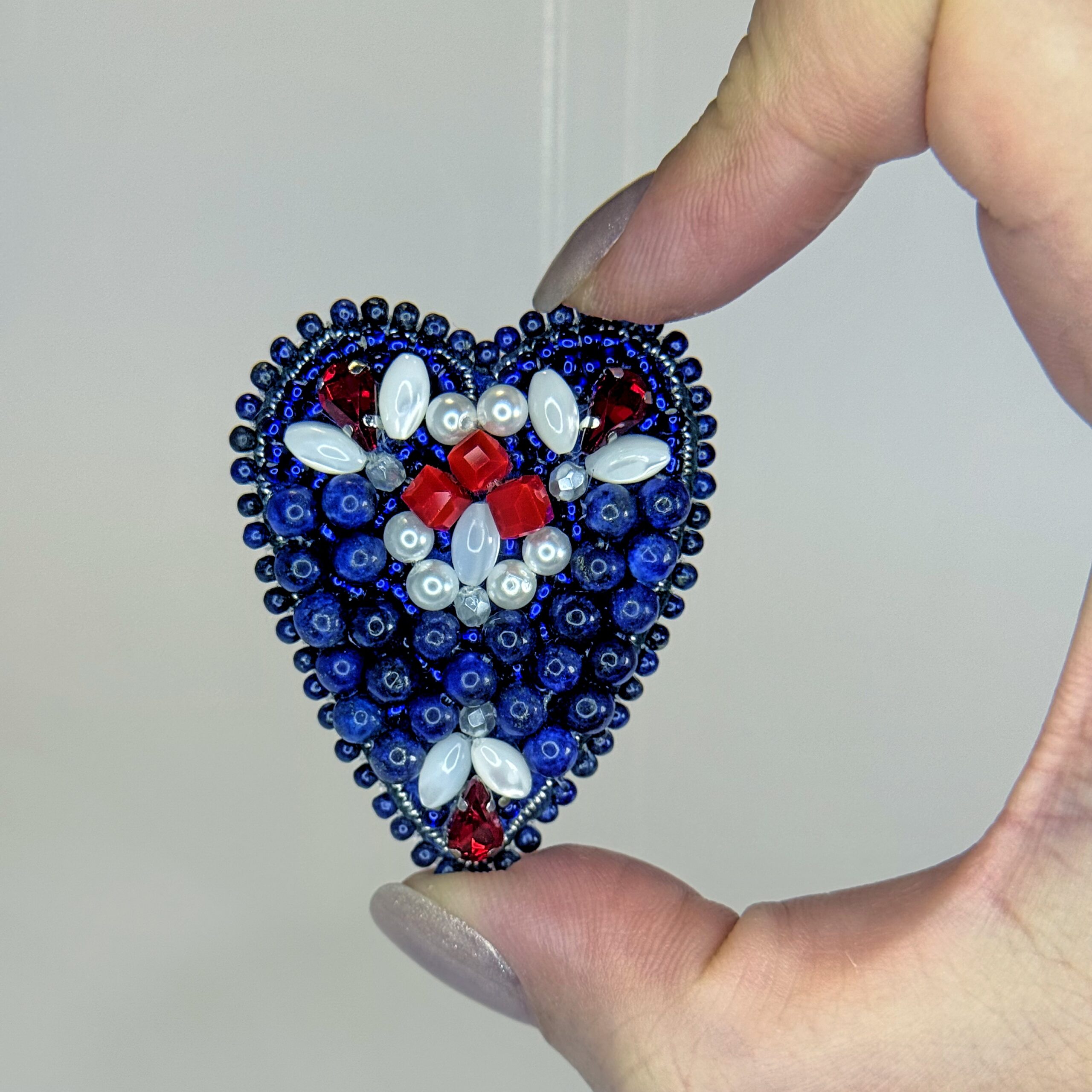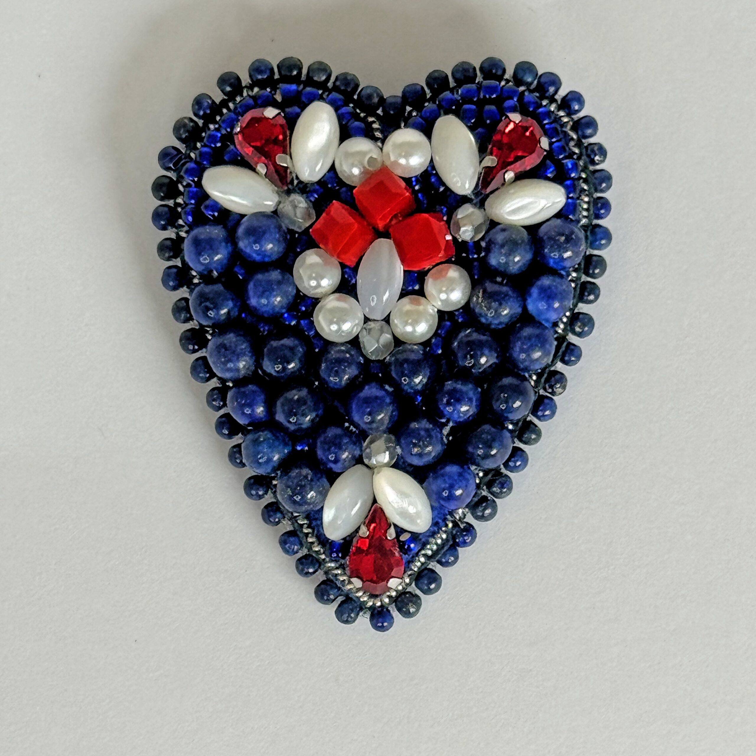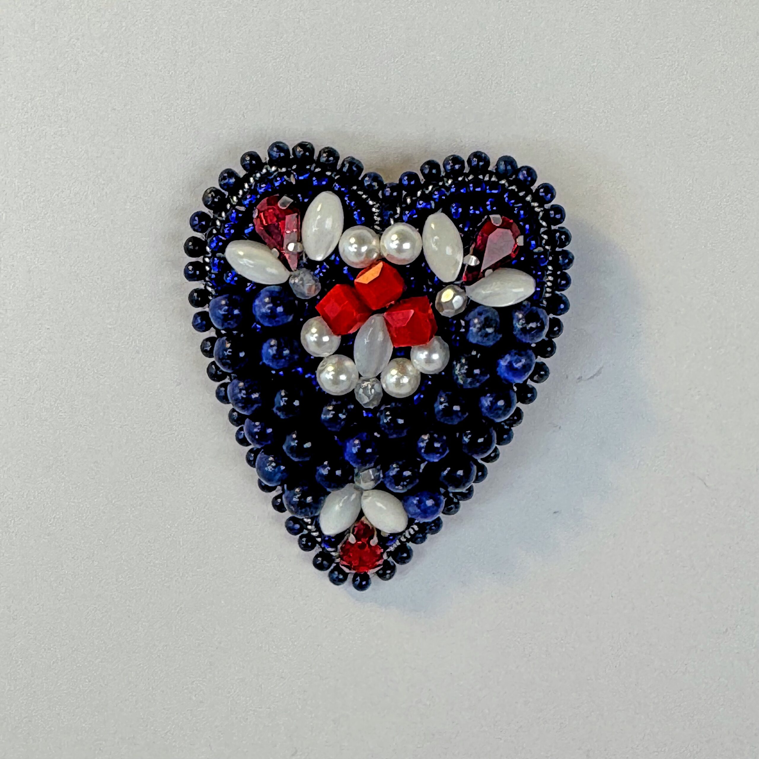 This handcrafted heart brooch features a rich Lapis Lazuli center, framed by the iridescent glow of natural Mother of Pearl. Accented with vibrant red crystals, this piece is designed for those who love jewelry with meaning and contrast. Whether it’s a gift for a loved one or a treat for yourself, this heart adds touch to any outfit.
