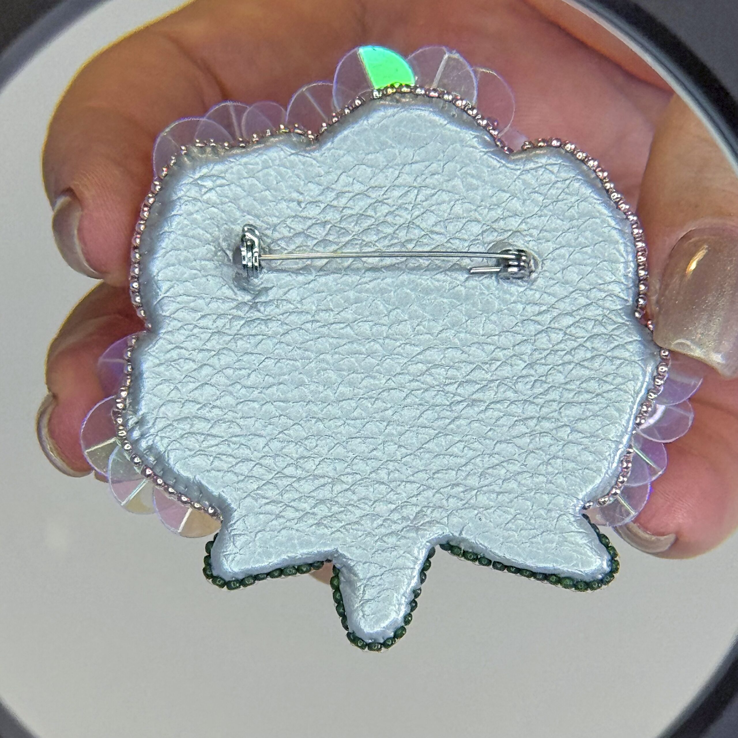The flower features figured sequins that give the peony its realistic volume, while a rhinestone chain and Cat Eye stones add a from angle. The edges are neatly finished with a beaded border, and the back is made of high-quality eco-leather.