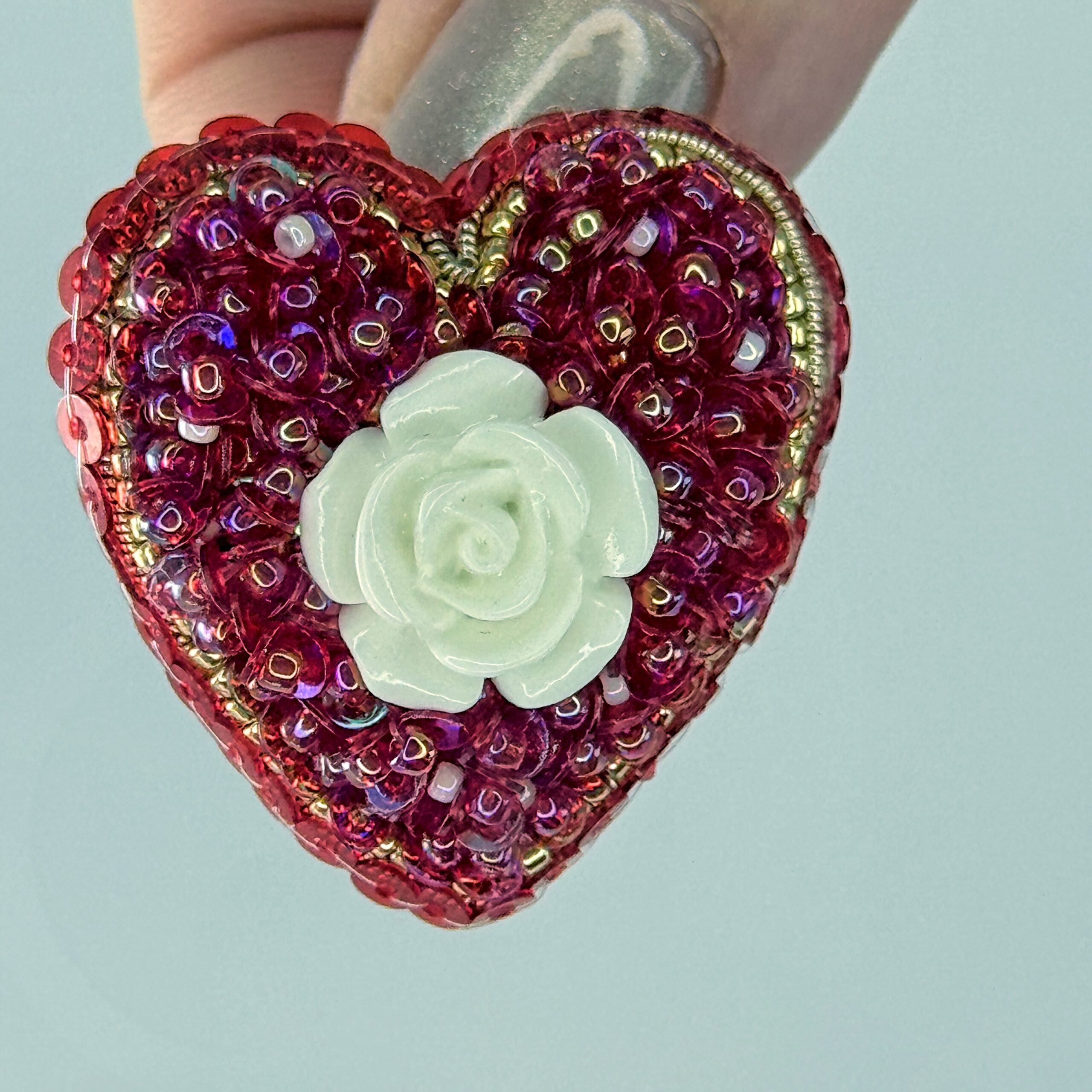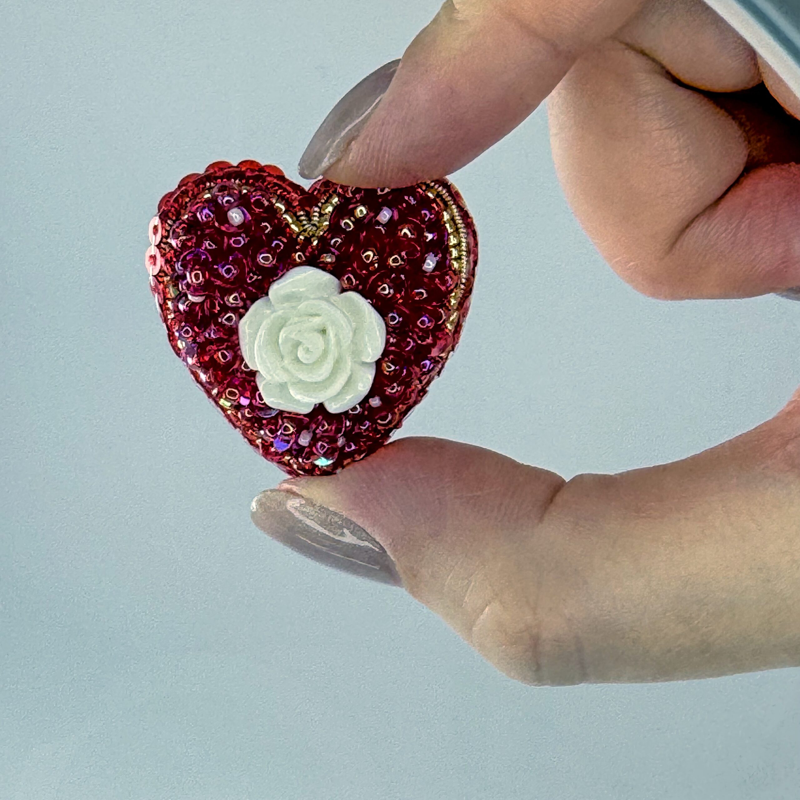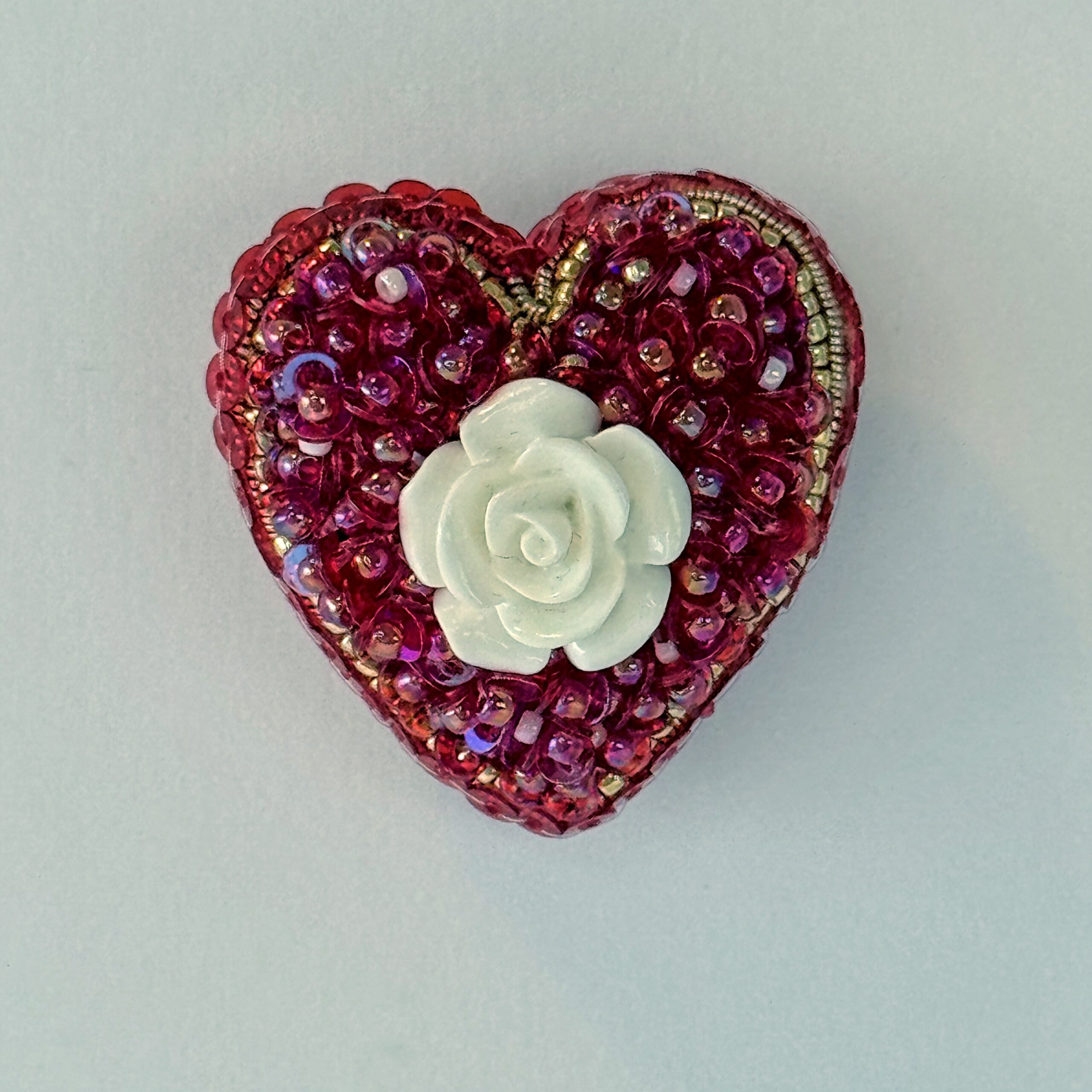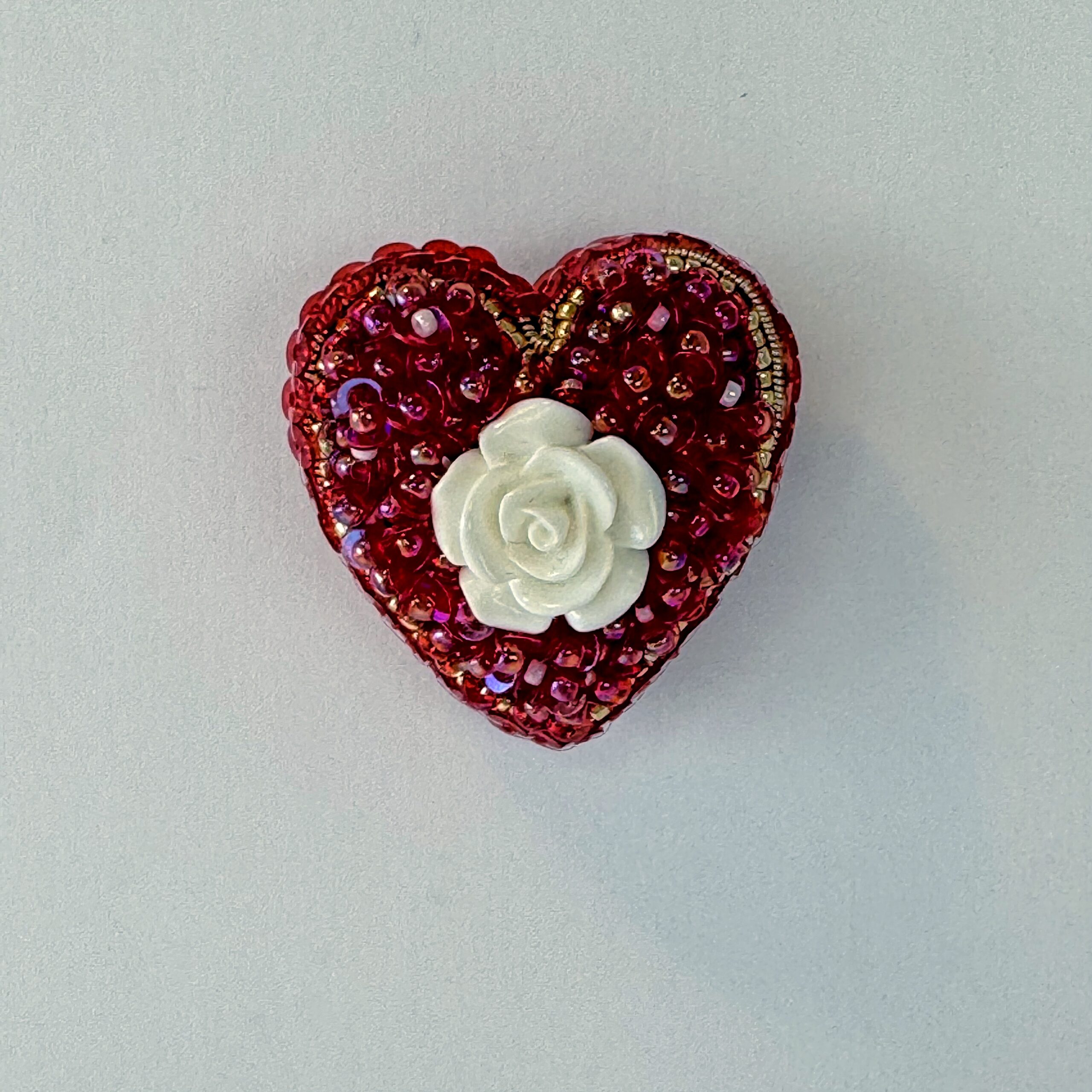 Red sequins and beads surround a sculpted white rose, all in a classic heart shape. A small brooch with vivid color and a sweet, tactile quality.