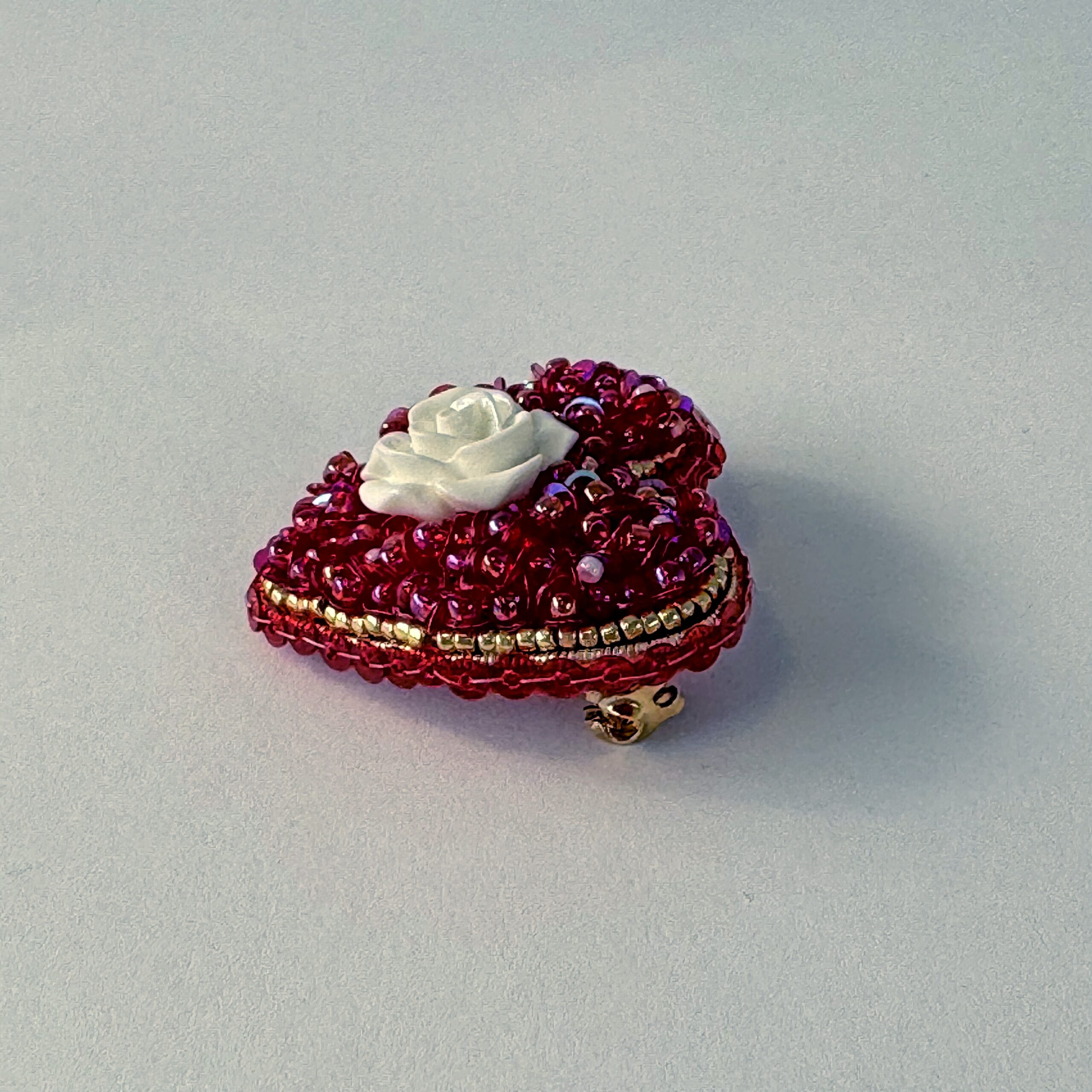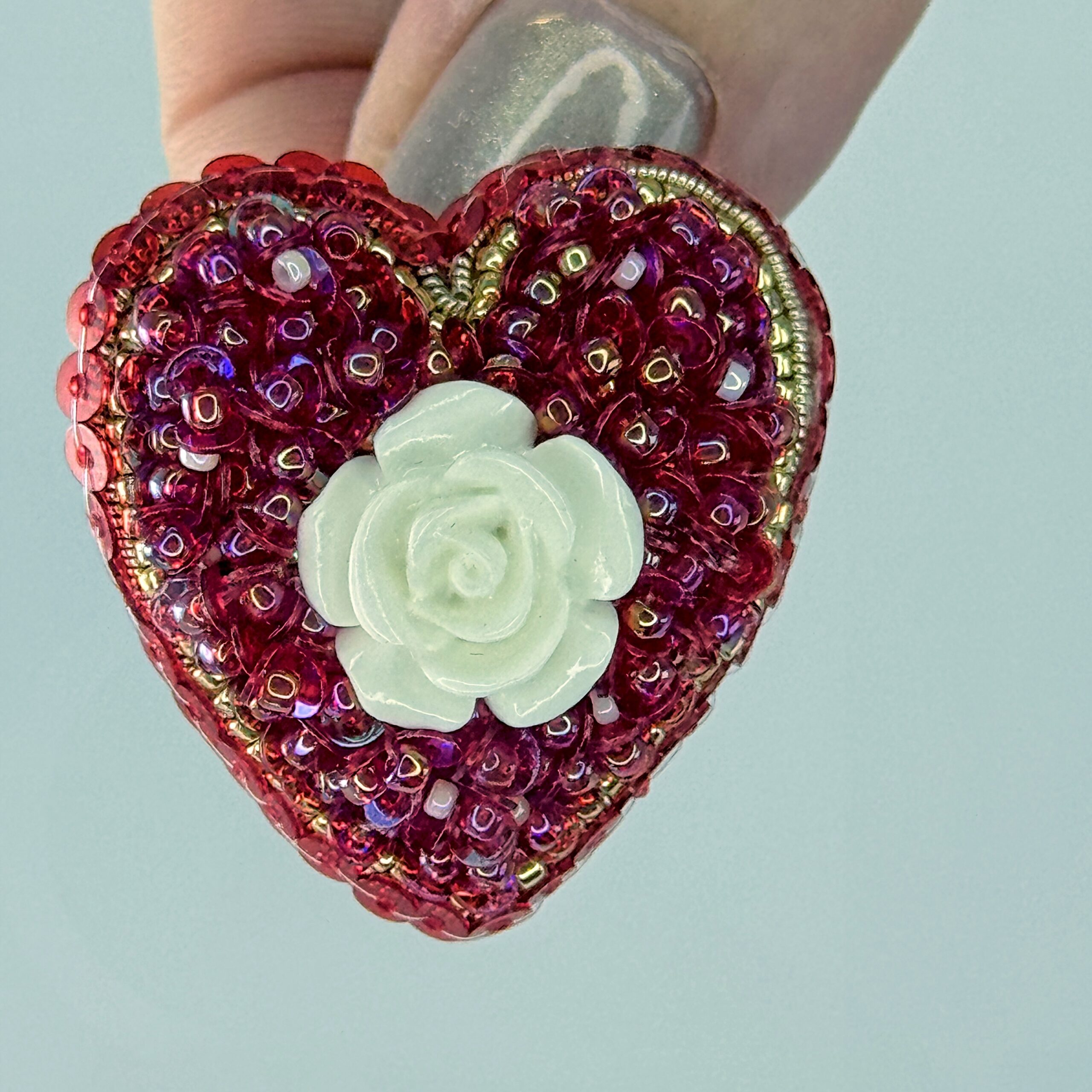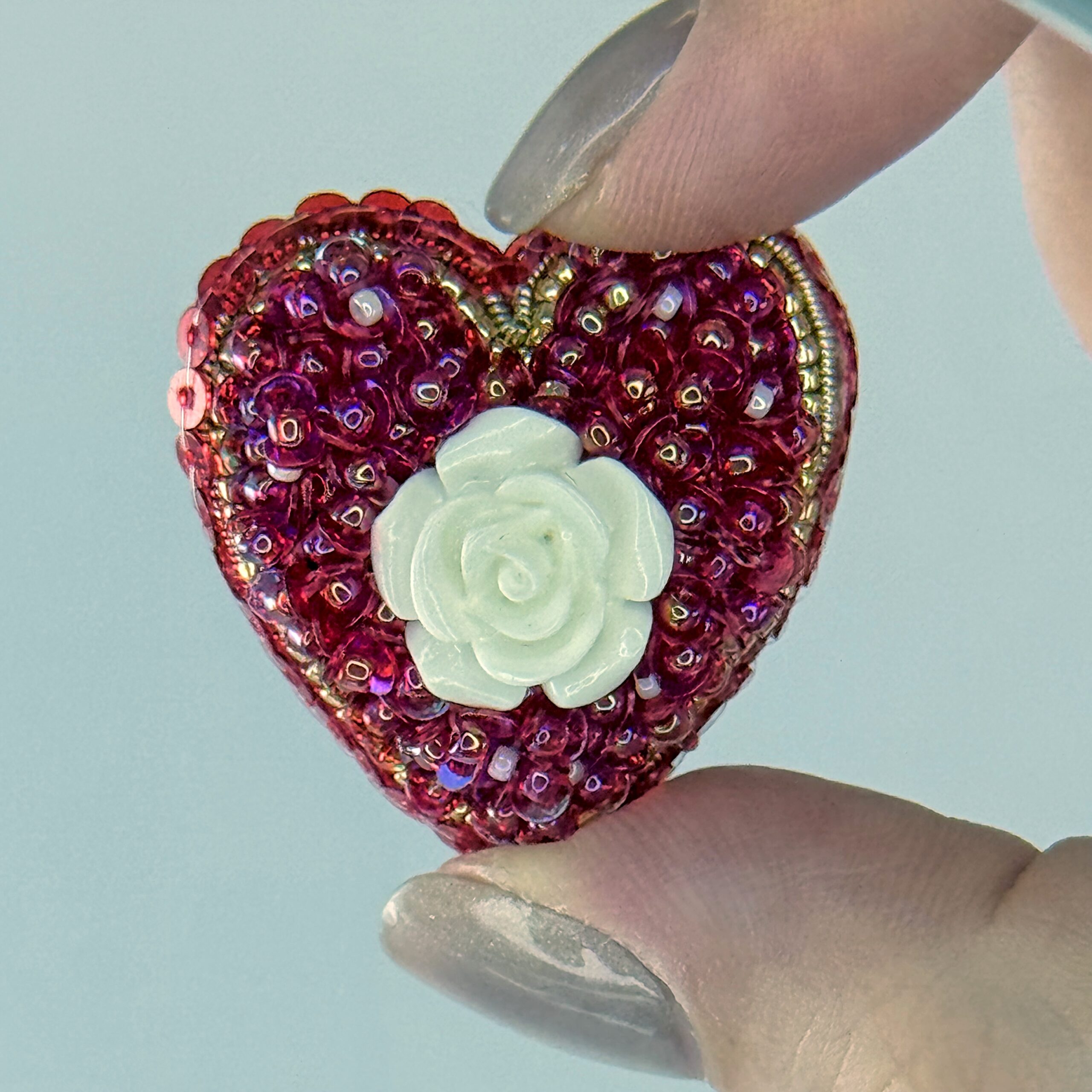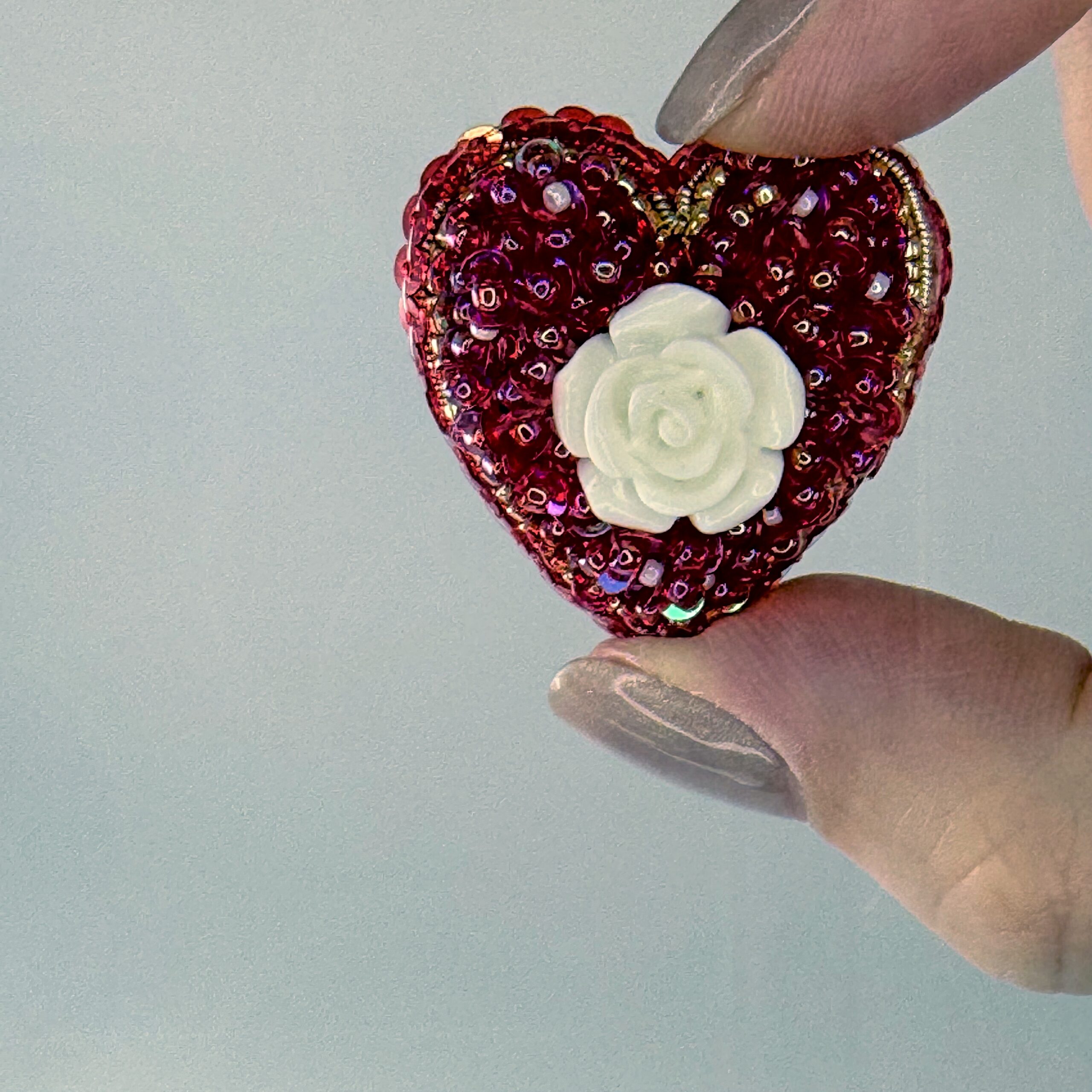 Red sequins and beads surround a sculpted white rose, all in a classic heart shape. A small brooch with vivid color and a sweet, tactile quality.
