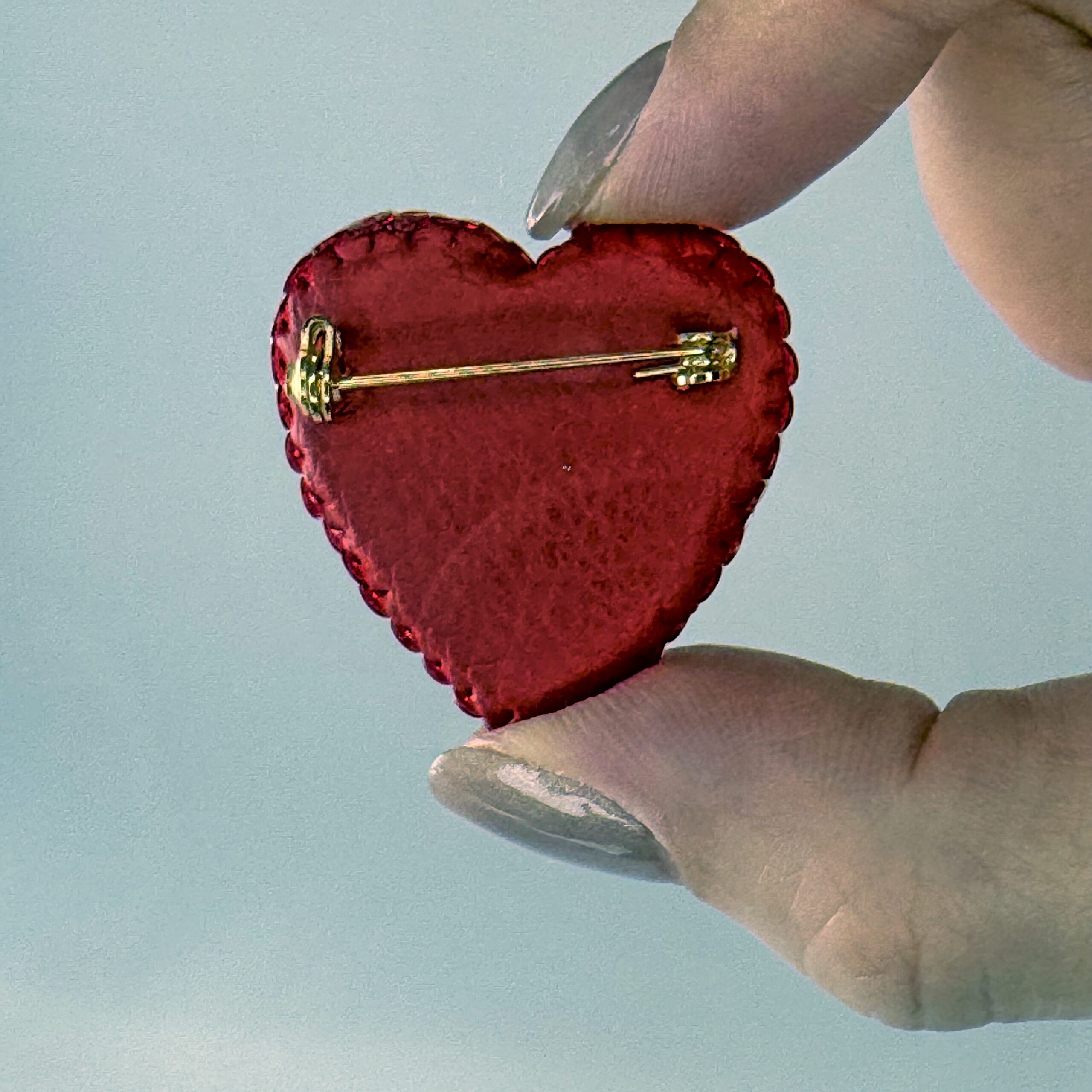 Looks charming on a dark denim jacket or a navy blue cardigan. Pin it to a camel wool coat for a flash of warmth on a grey day. Pairs well with classic contrasts — navy and red, black and white, or cream and crimson.
