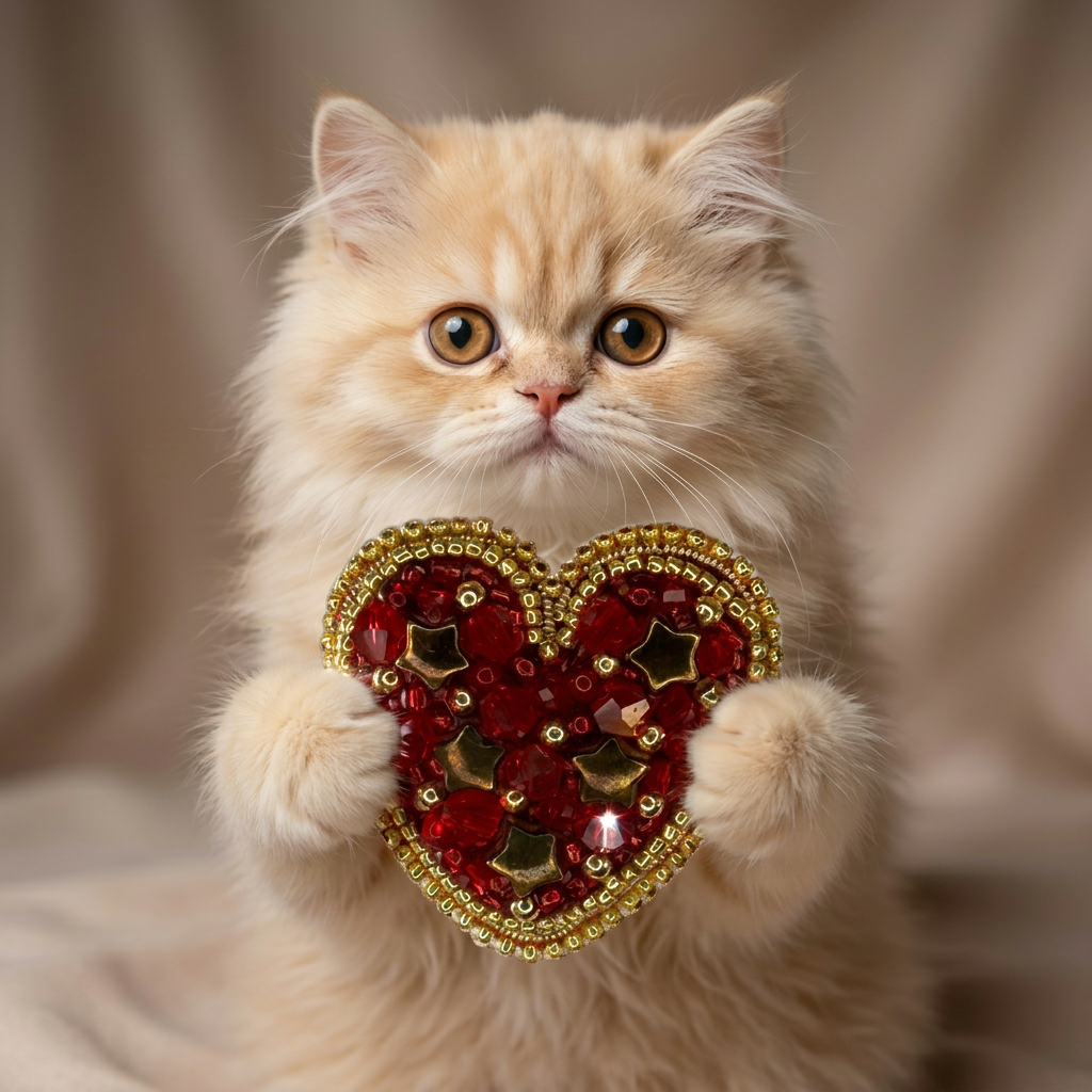 A heart that holds the stars — this enchanting red heart brooch is filled with deep red faceted crystals and scattered gold star-shaped beads that sparkle like constellations against the crimson background. The gold stars give this piece a celestial, magical quality that elevates it beyond a simple heart brooch. A warm gold seed bead border frames the entire composition with luxurious warmth.