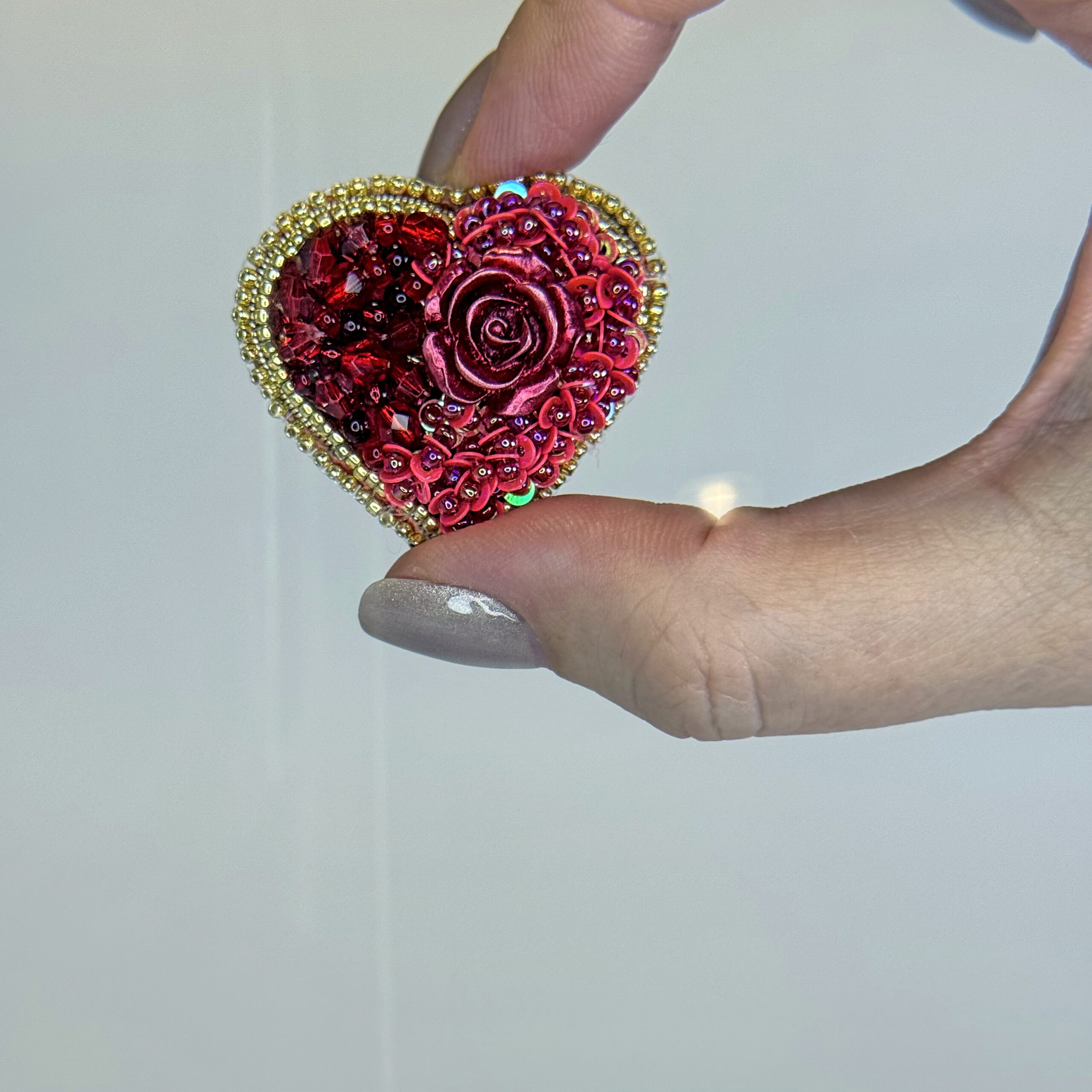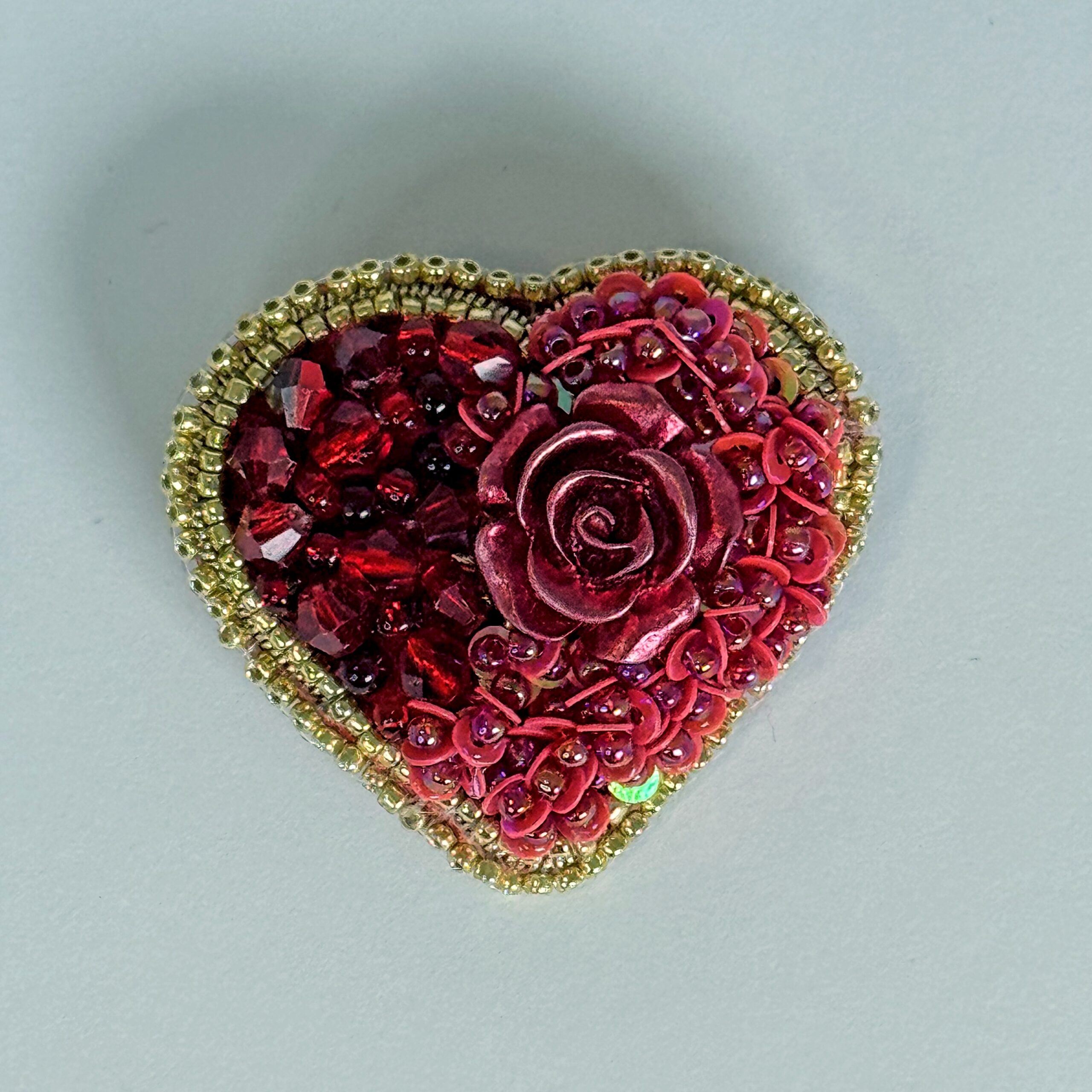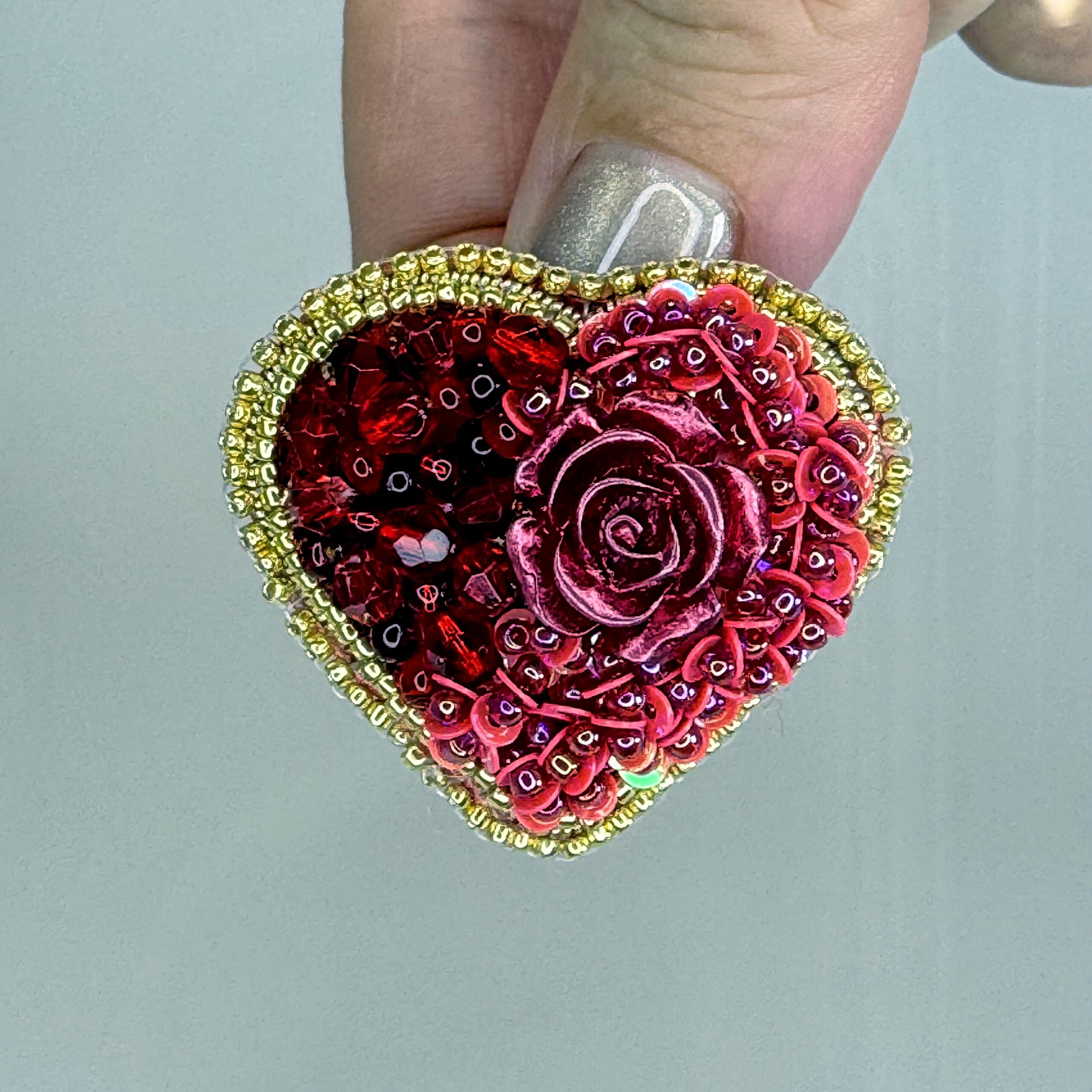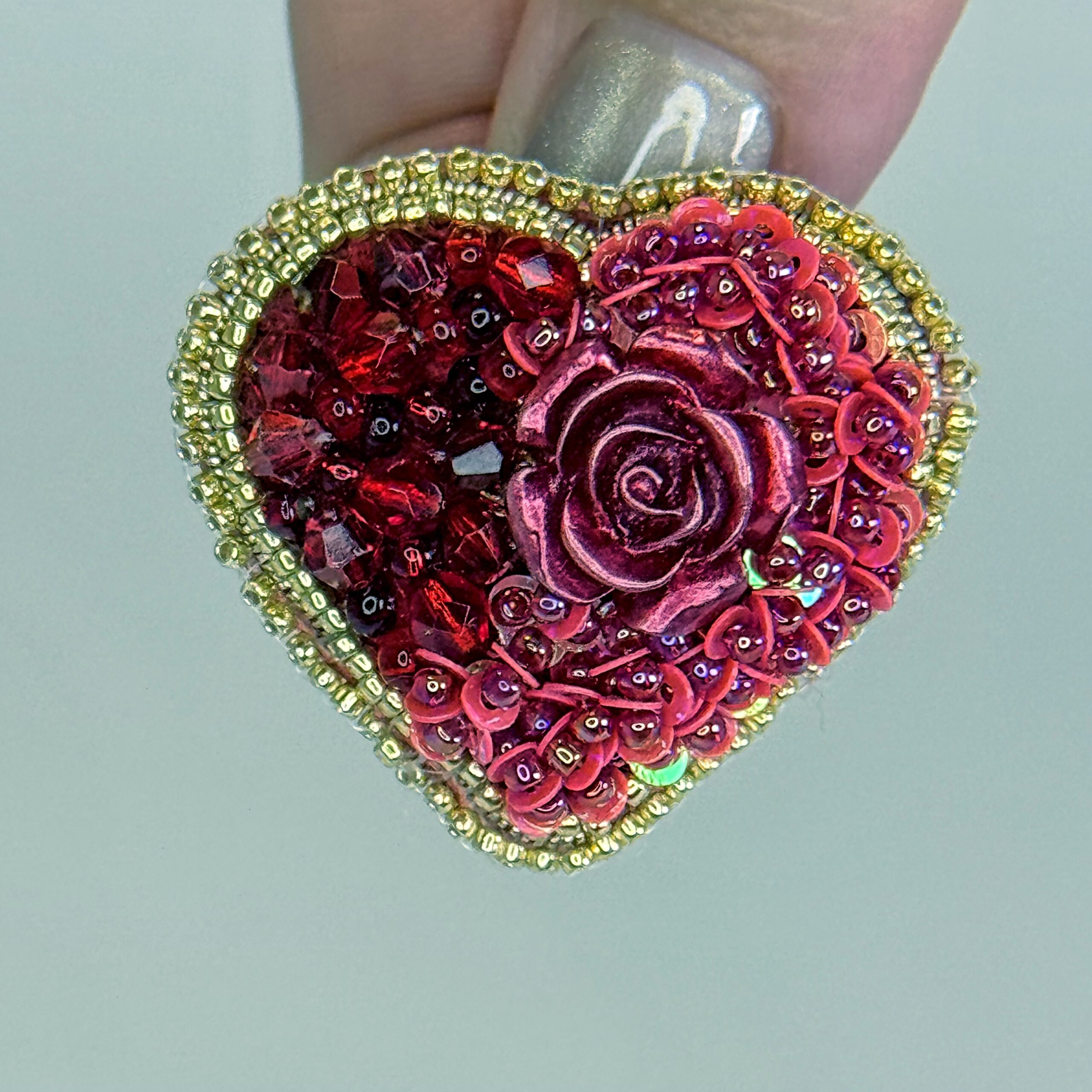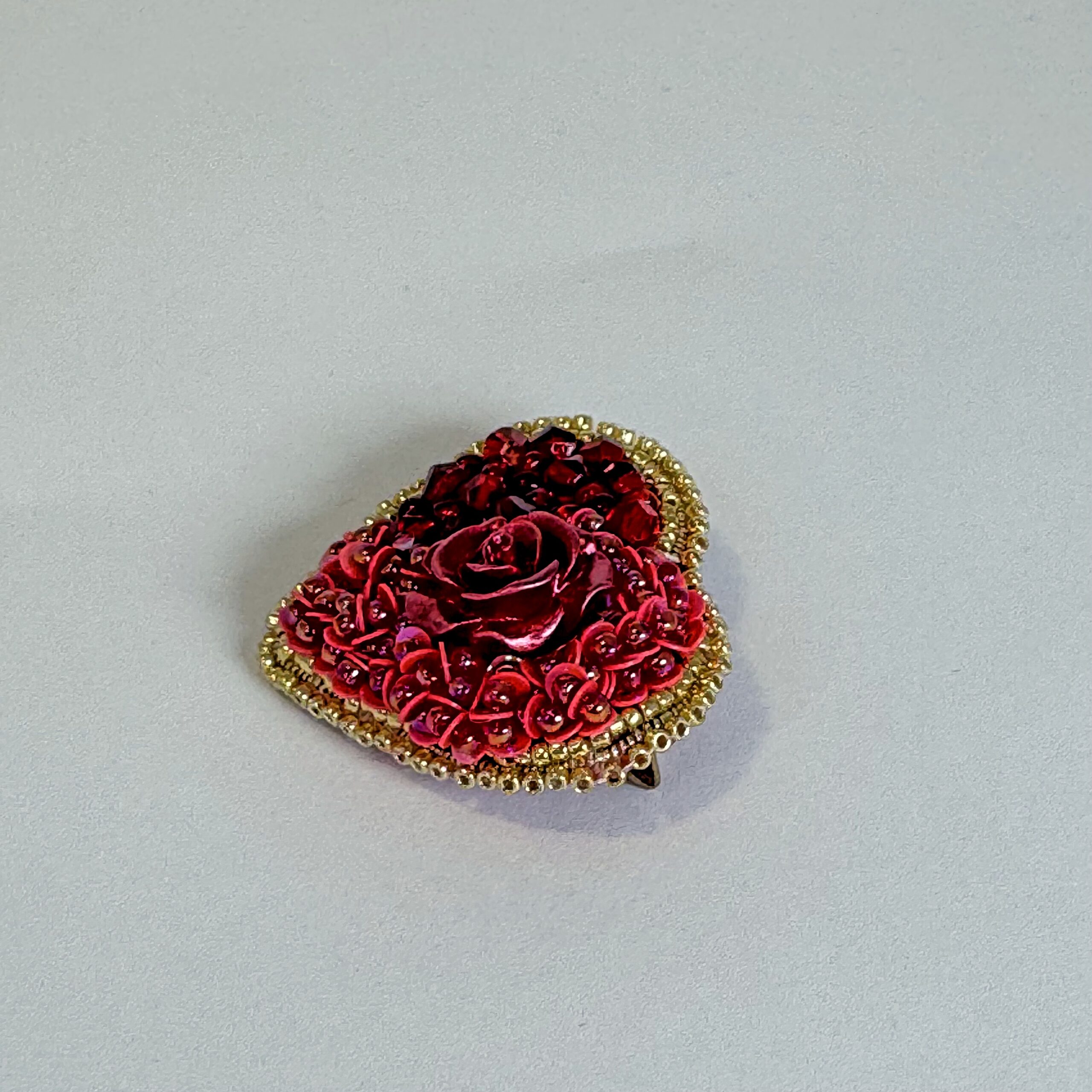 Drama, passion, and romance embodied in one extraordinary brooch — a large, three-dimensional red rose cabochon dominates the center of this deep red heart, surrounded by layers of shimmering red sequins that ripple across the surface. A border of warm gold seed beads frames the heart with golden luxury. The prominent 3D rose gives this piece exceptional visual depth and sculptural presence, making it the ultimate Valentine's Day statement.