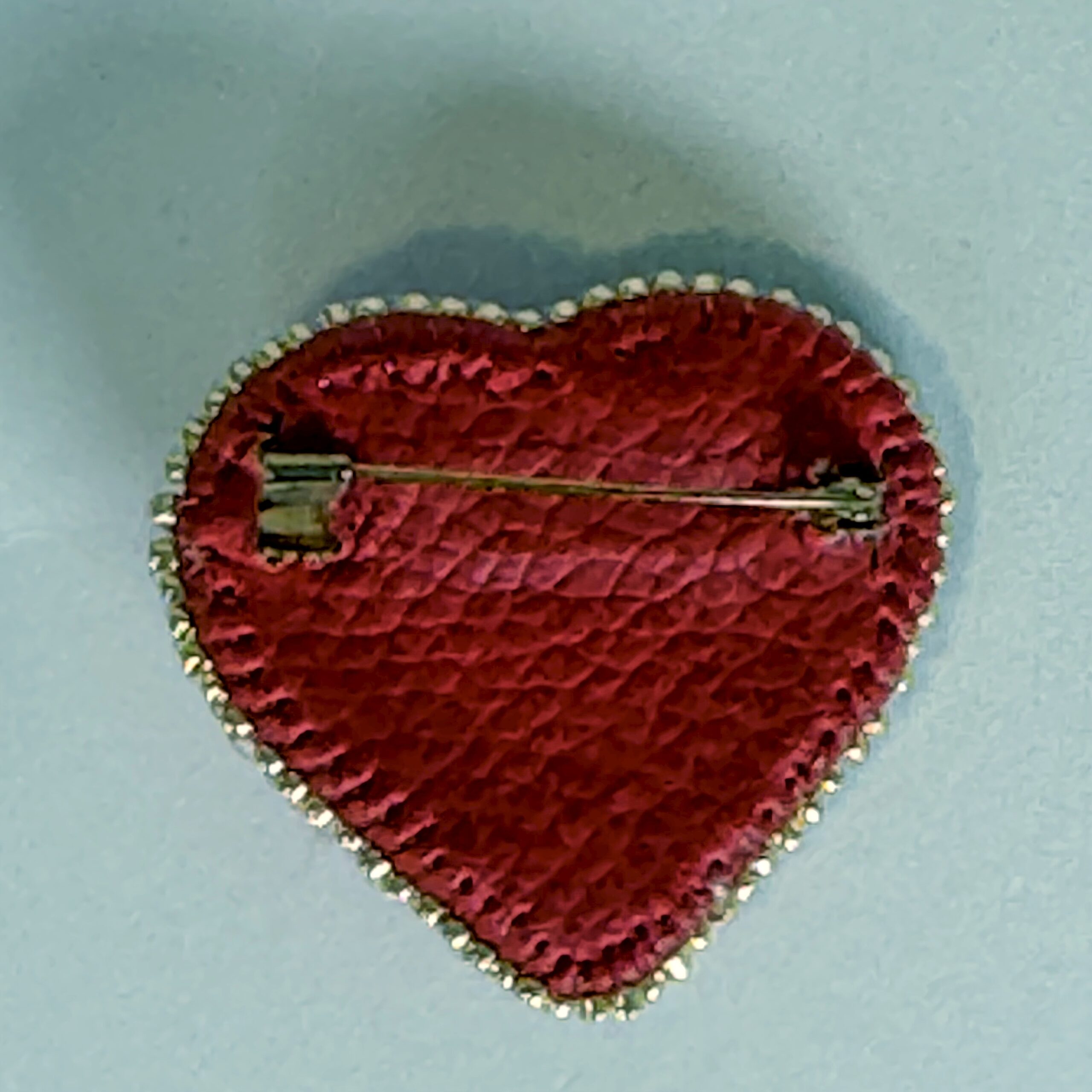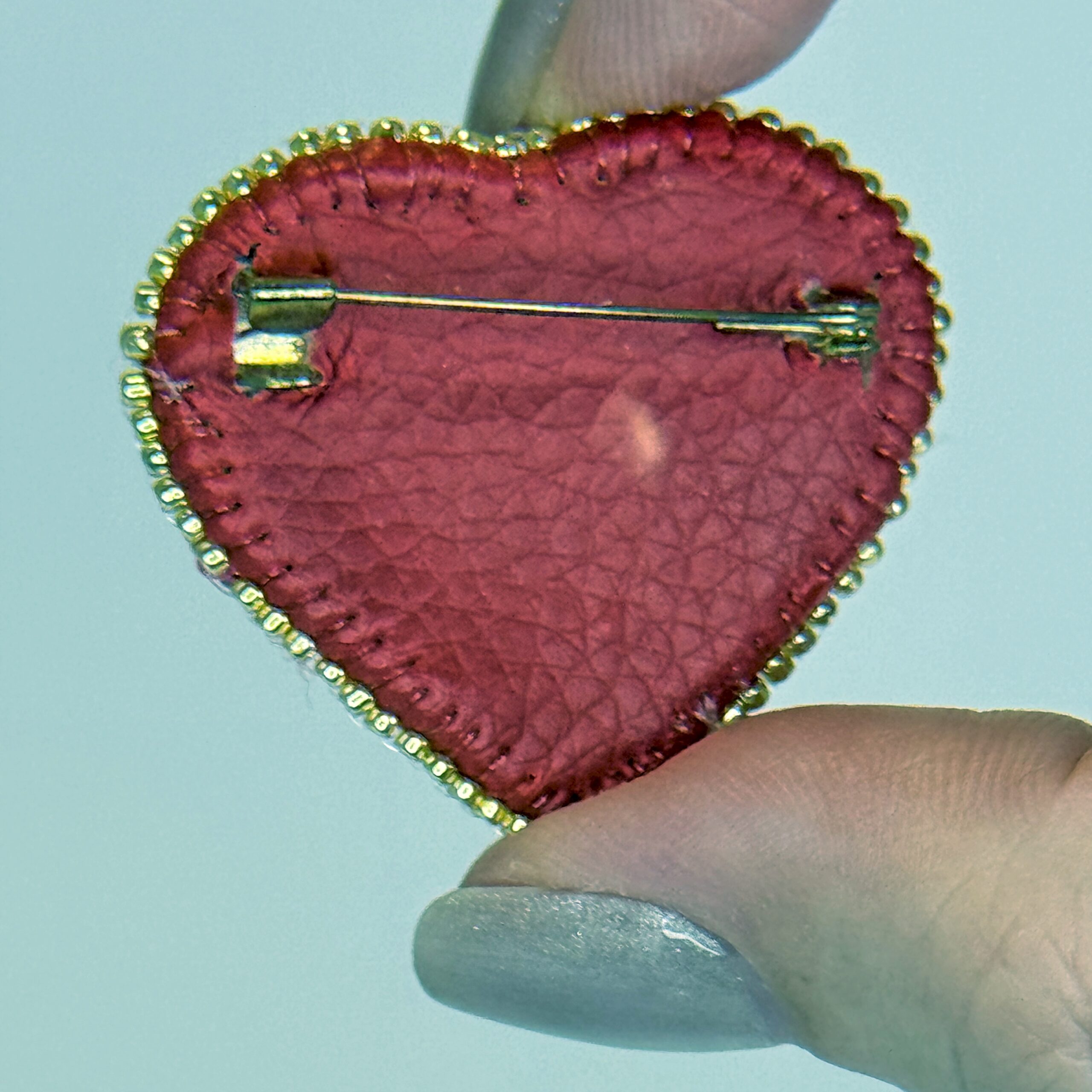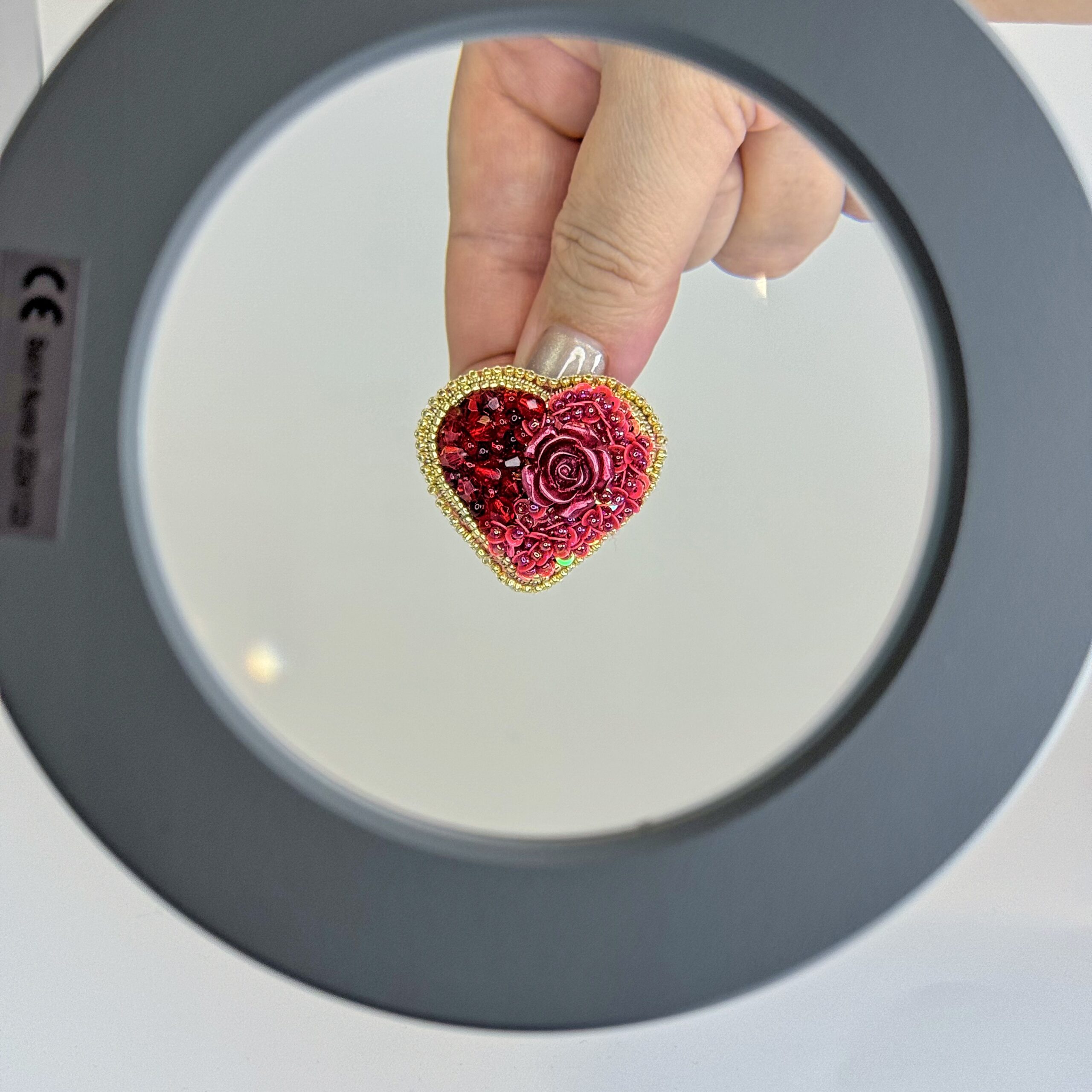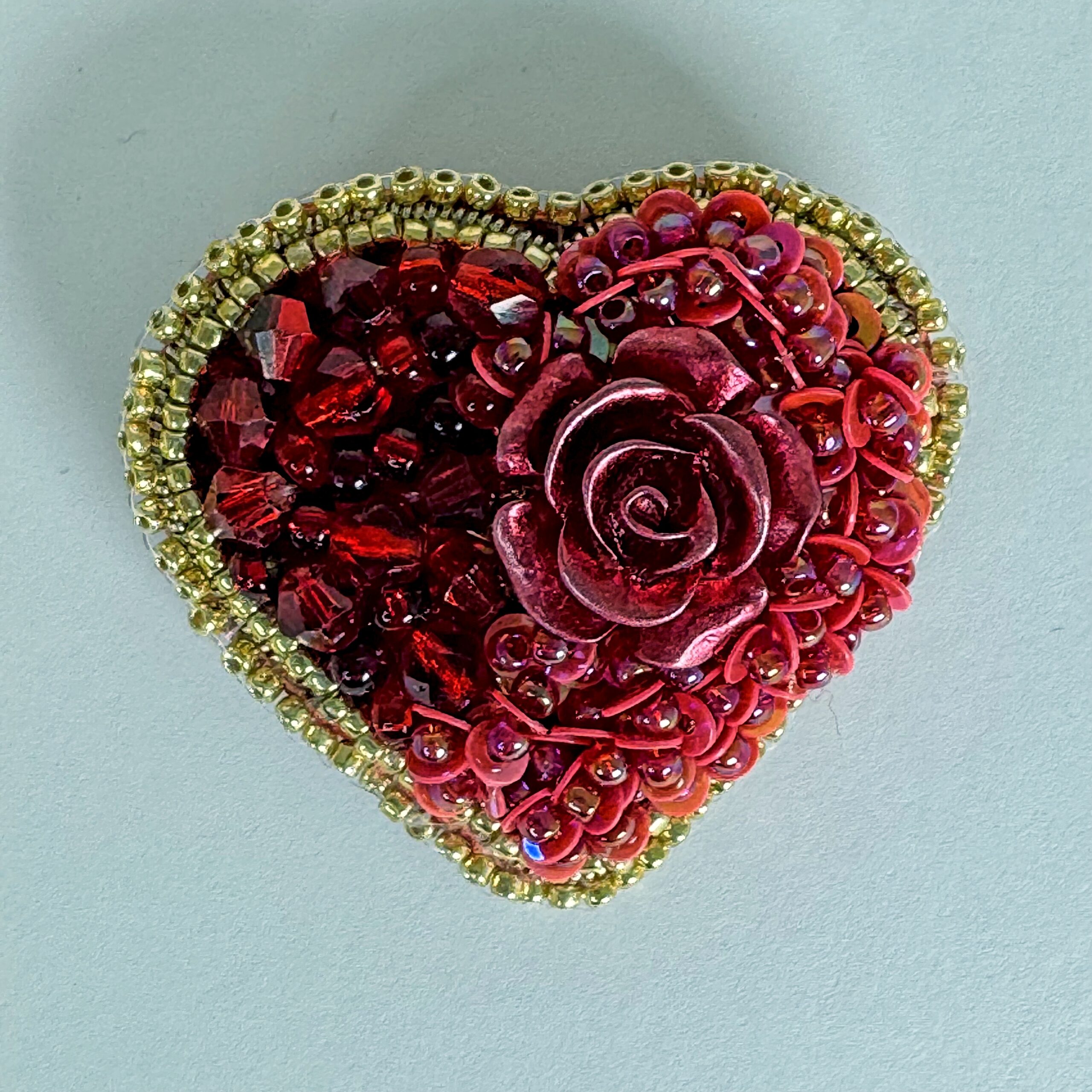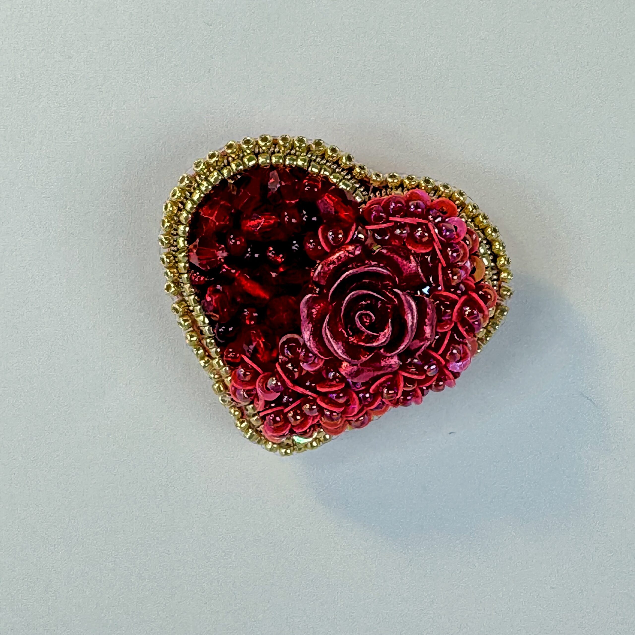 Drama, passion, and romance embodied in one extraordinary brooch — a large, three-dimensional red rose cabochon dominates the center of this deep red heart, surrounded by layers of shimmering red sequins that ripple across the surface. A border of warm gold seed beads frames the heart with golden luxury. The prominent 3D rose gives this piece exceptional visual depth and sculptural presence, making it the ultimate Valentine's Day statement.