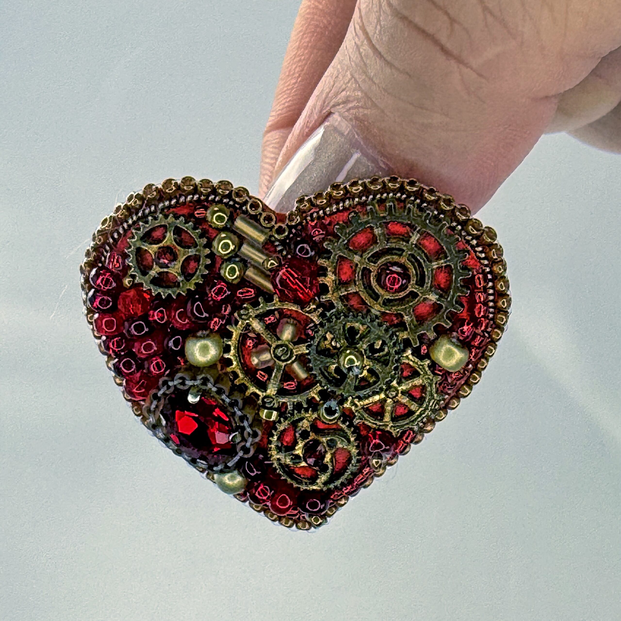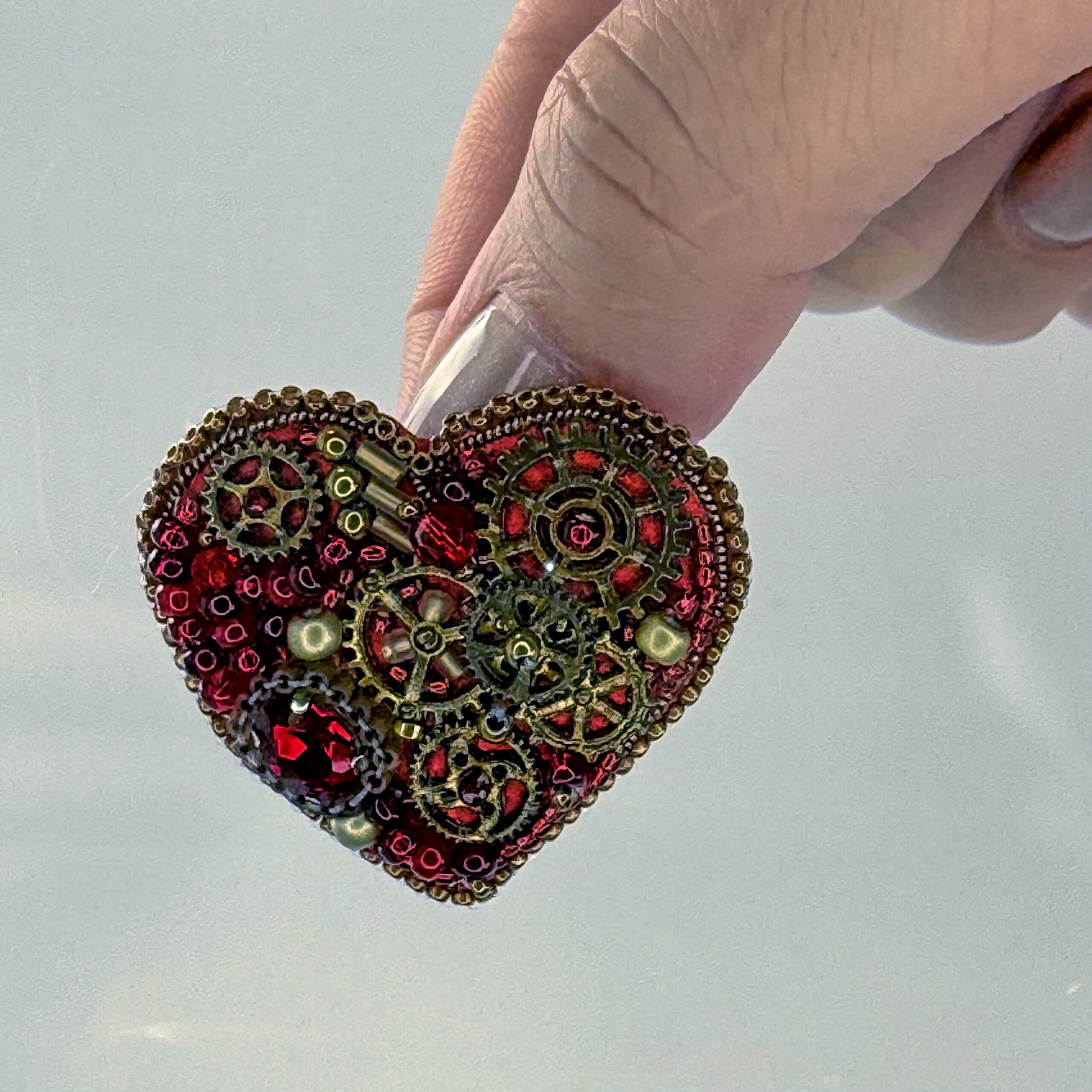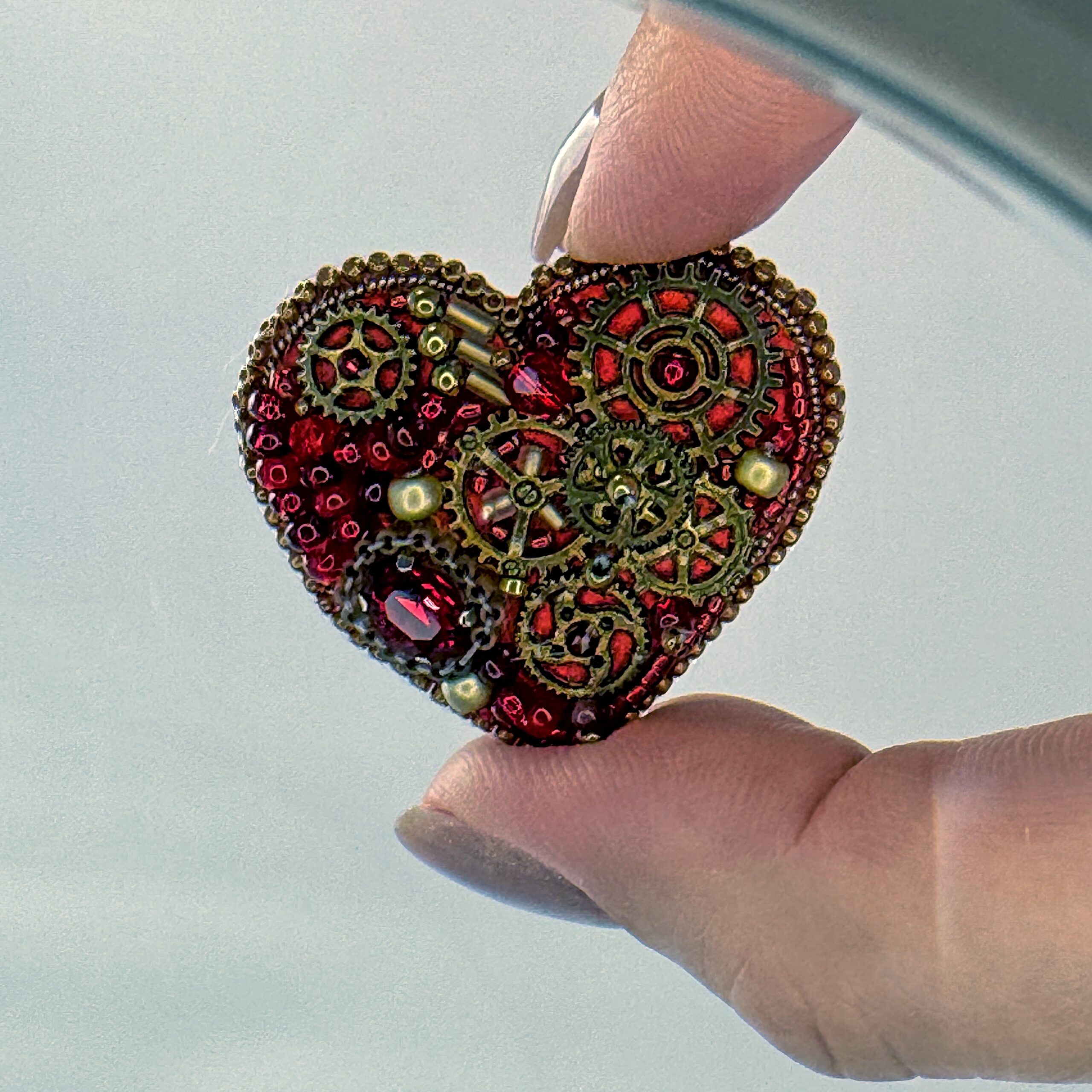 A heart shape with an intricate mix of deep red and golden mechanical details — gears, wheels, and figured beads. It’s a medium-size brooch with a lot of character.