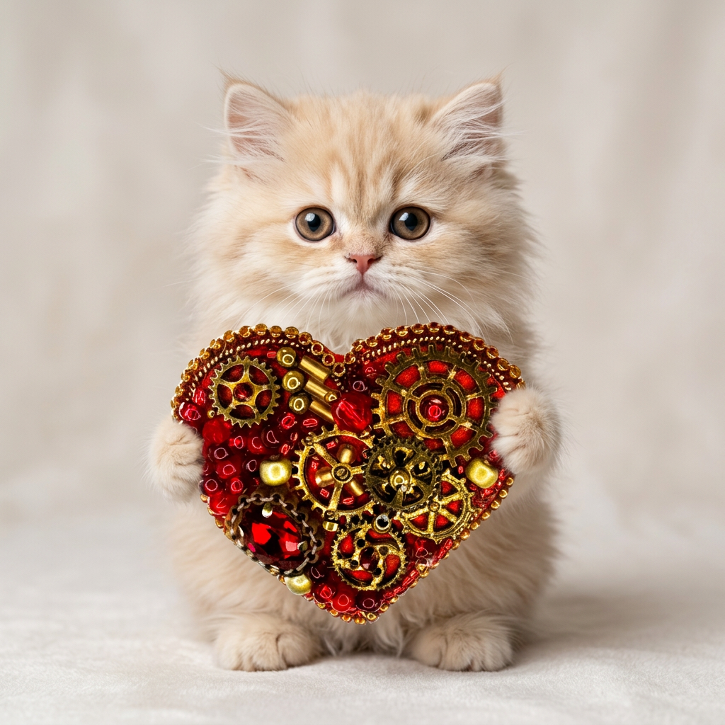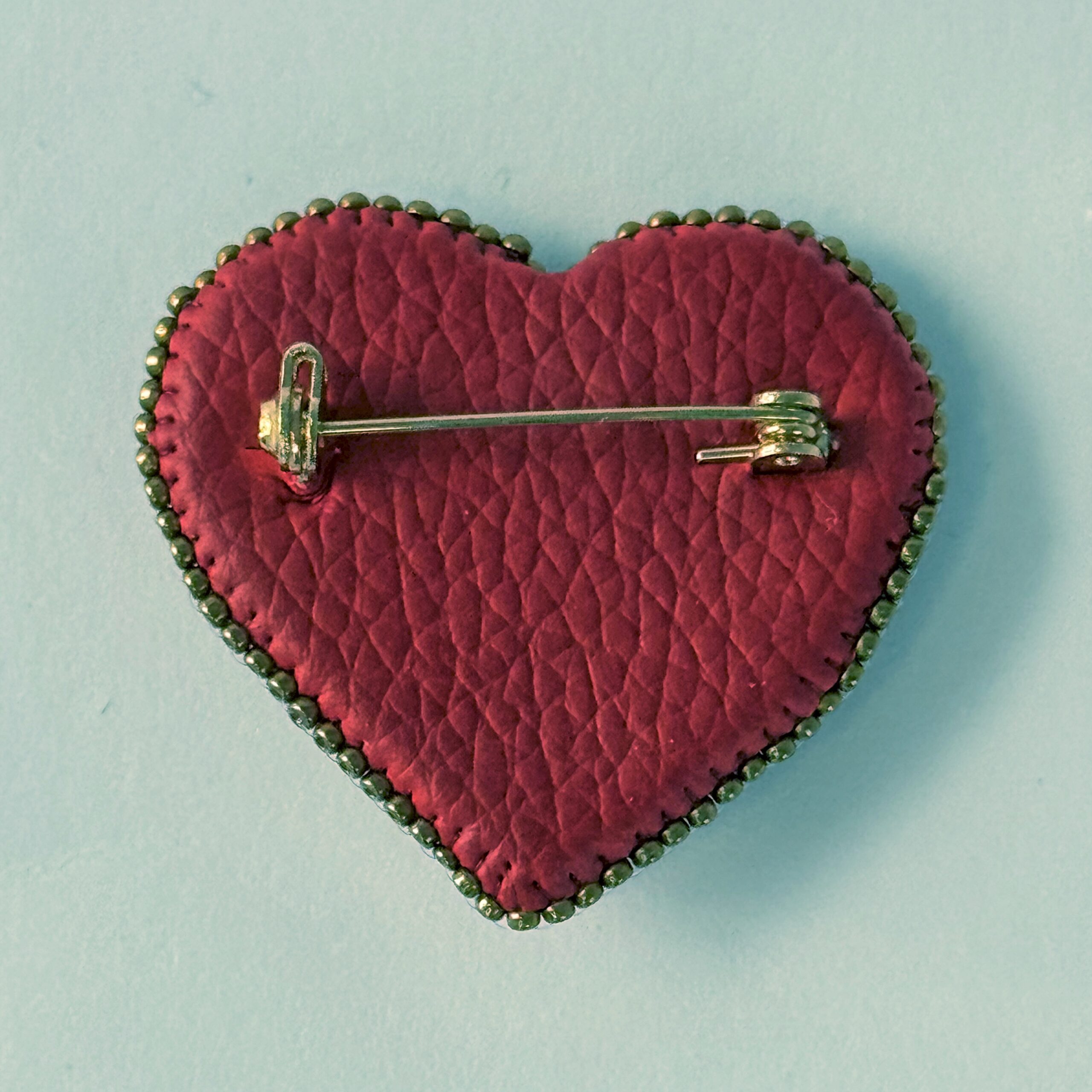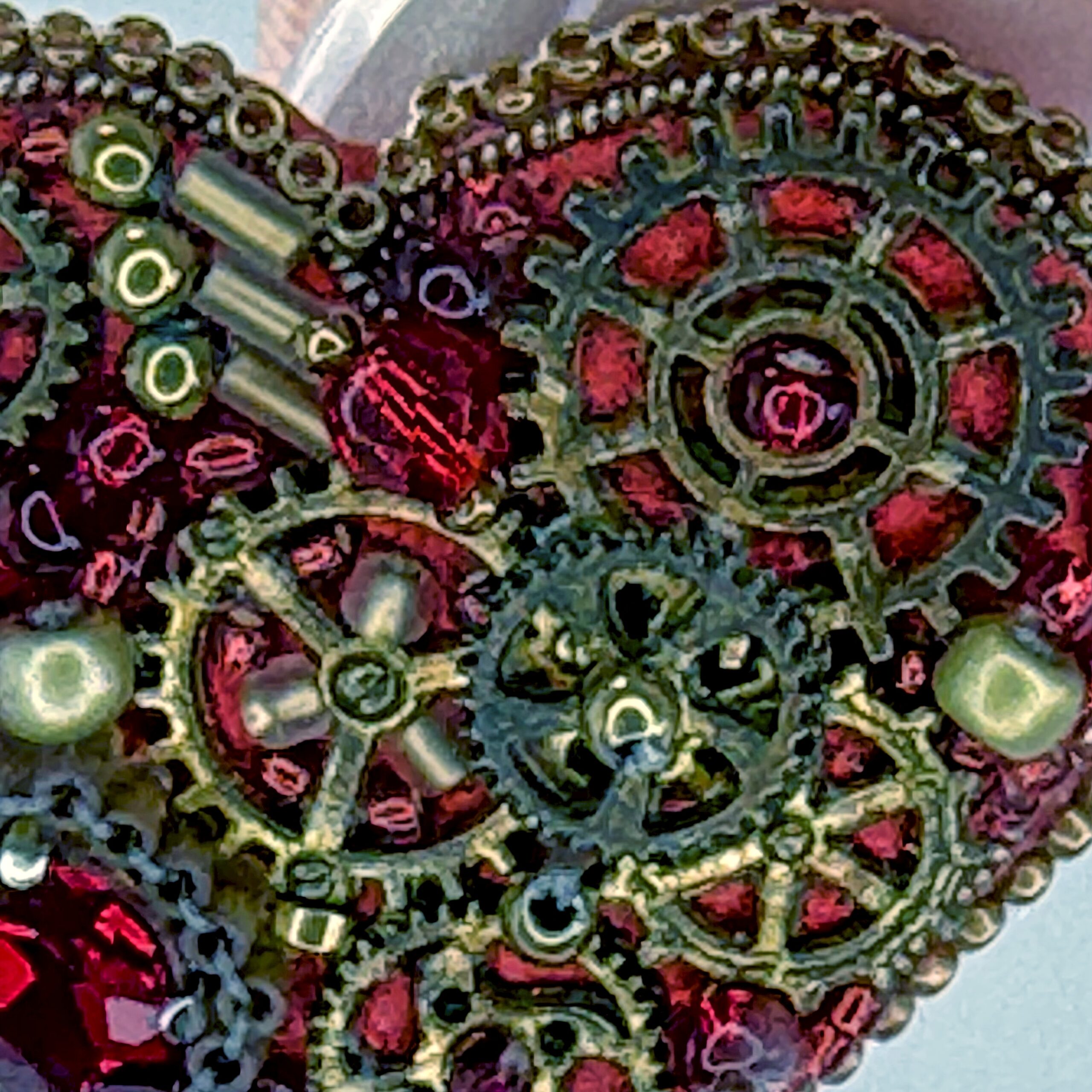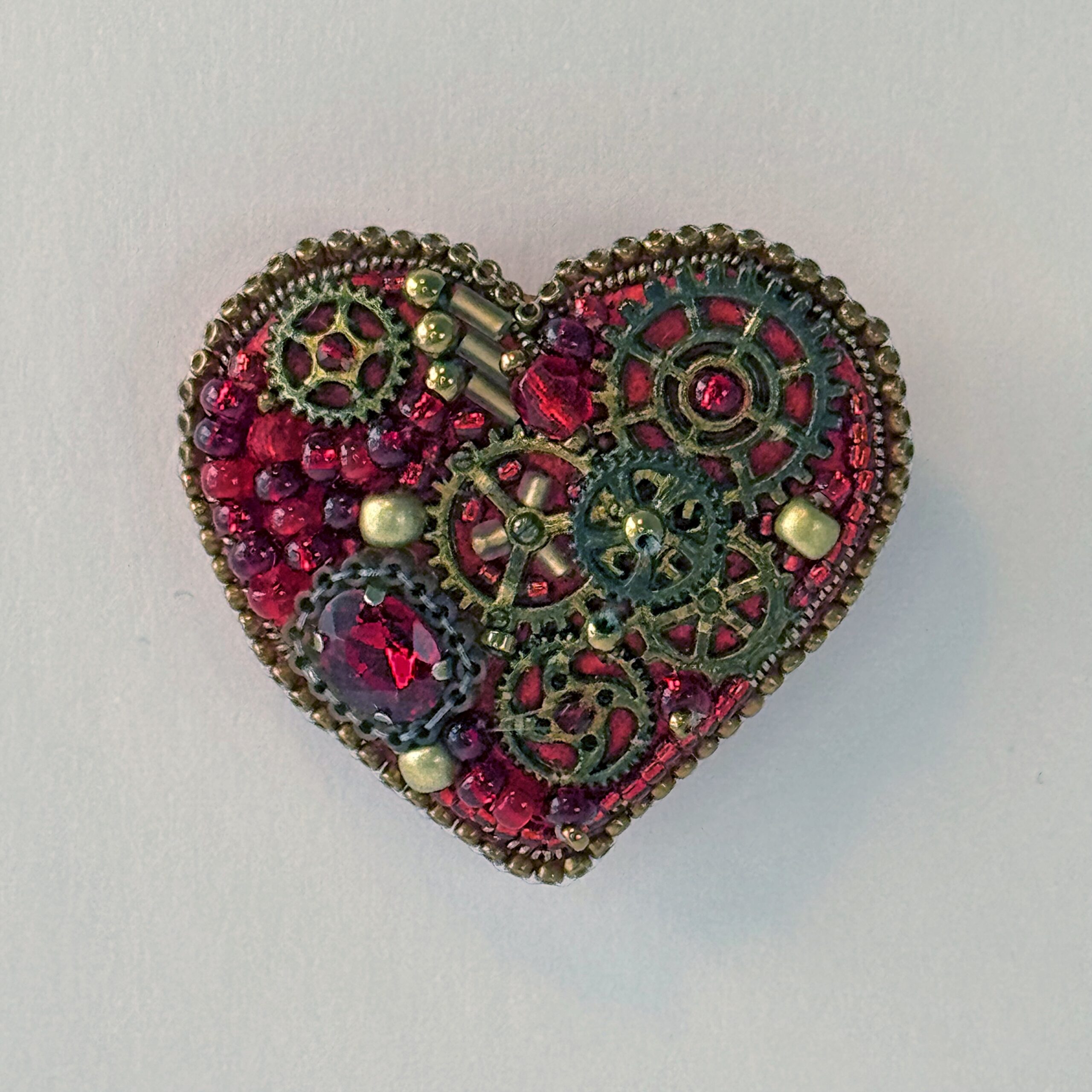 A heart shape with an intricate mix of deep red and golden mechanical details — gears, wheels, and figured beads. It’s a medium-size brooch with a lot of character.