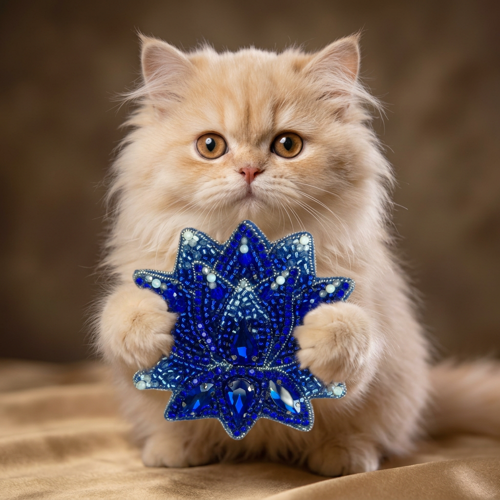 A breathtaking lotus in deep royal blue — this luxurious handcrafted brooch radiates regal elegance. Large faceted sapphire-blue crystals gleam at the center and along the lower petals, while delicate mother-of-pearl accents add an ethereal shimmer throughout. Each petal is carefully shaped with blue seed beads and glass beads, and the entire piece is framed by a polished silver canitel wire edge that catches the light beautifully. A statement piece worthy of any occasion.